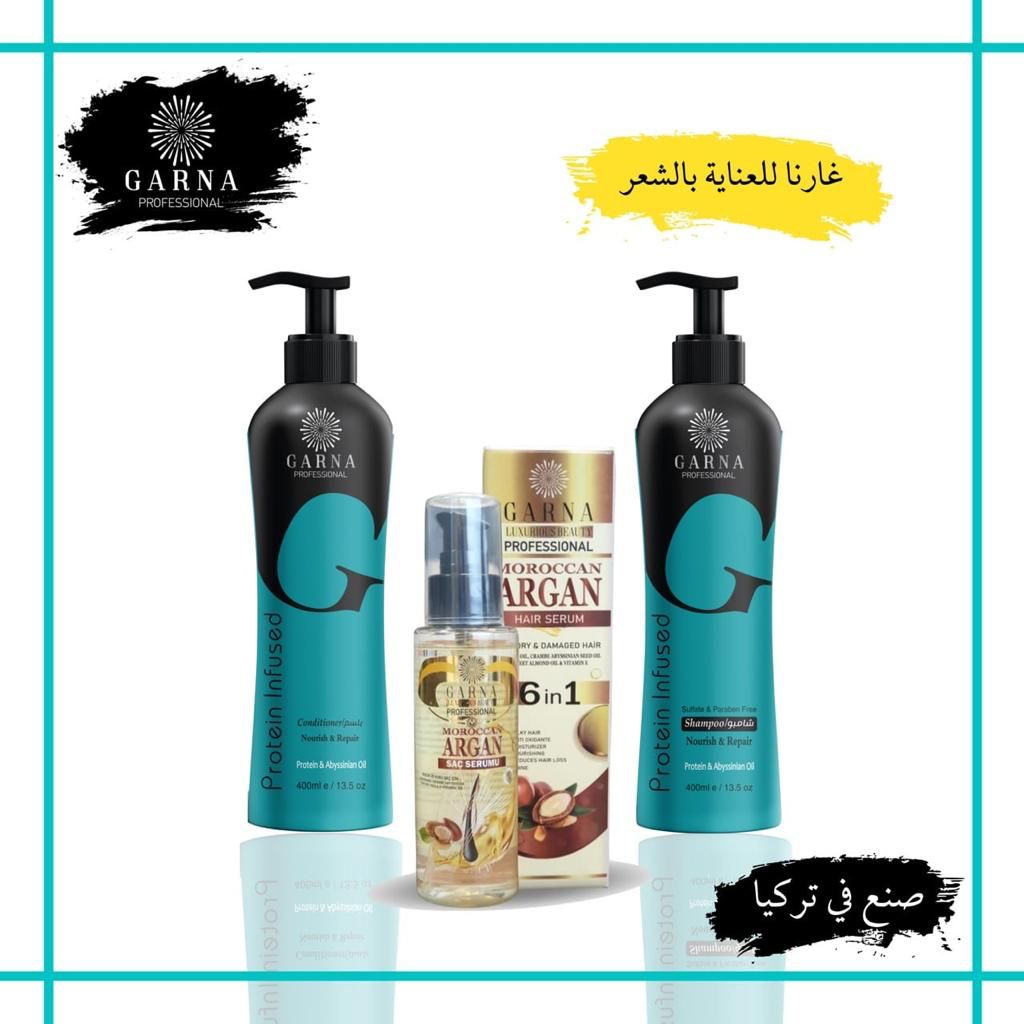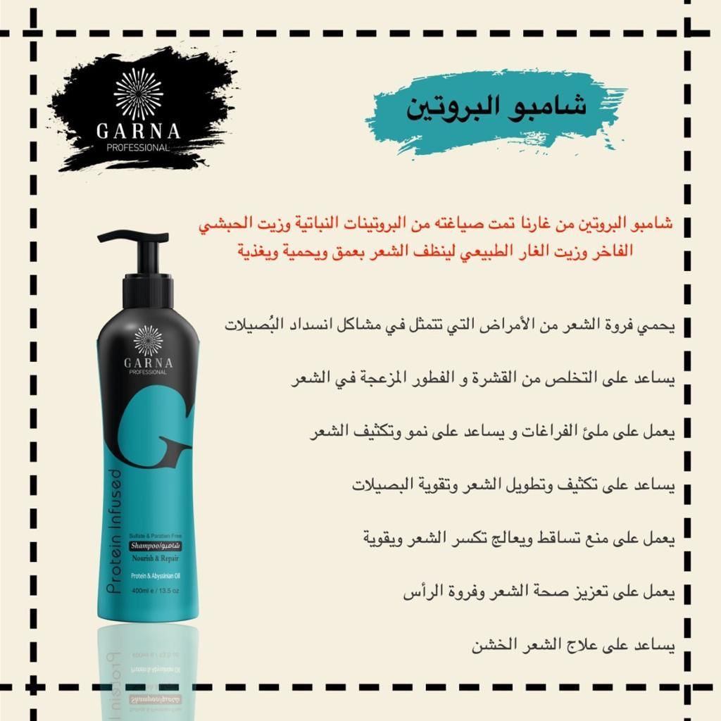 شامبو البروتين من غارنا تمت صياغته من البروتينات النباتية وزيت الحبشي الفاخر وزيت الغار الطبيعي لينظف الشعر بعمق ويحمية ويغذية