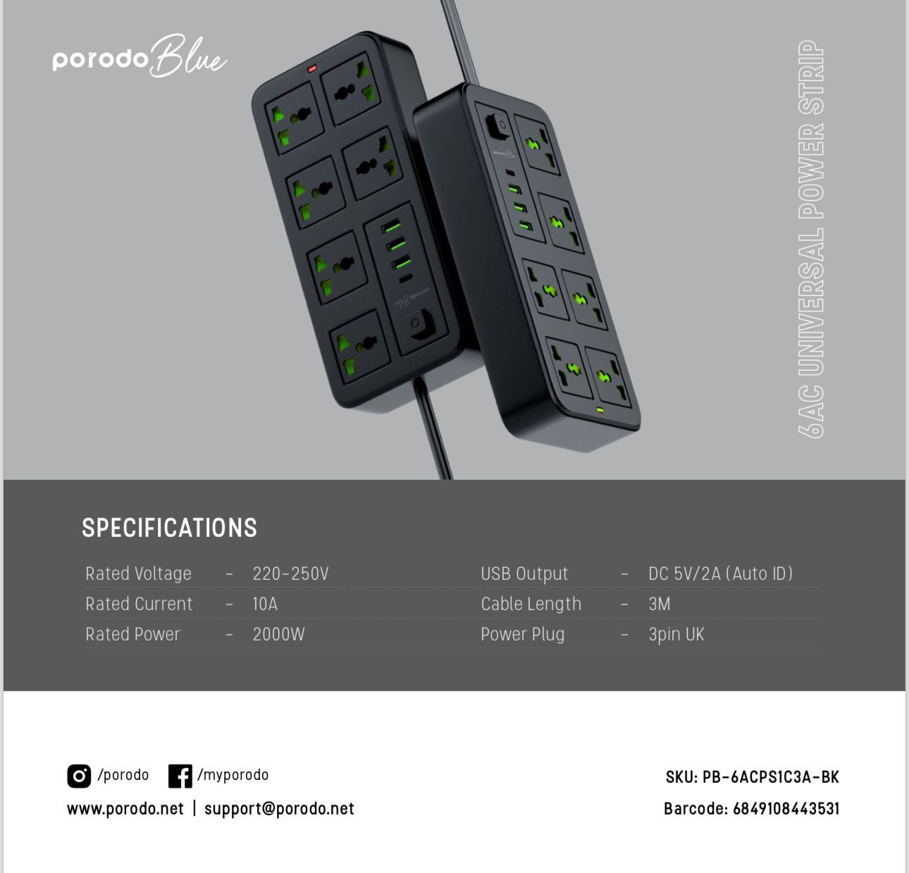 تحديد الفولطية 220-250 فولت التصنيف الحالي 10 أ القوة المصنفة 2000 واط مخرج يو اس بي تيار مستمر 5 فولت/2 أمبير (معرف تلقائي) طول السلك 3M قابس الطاقة 3pin المملكة المتحدة