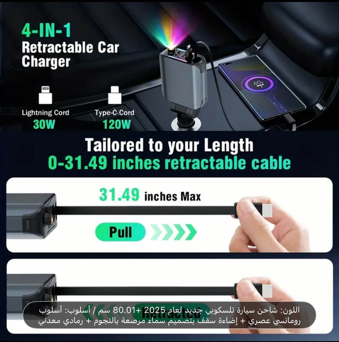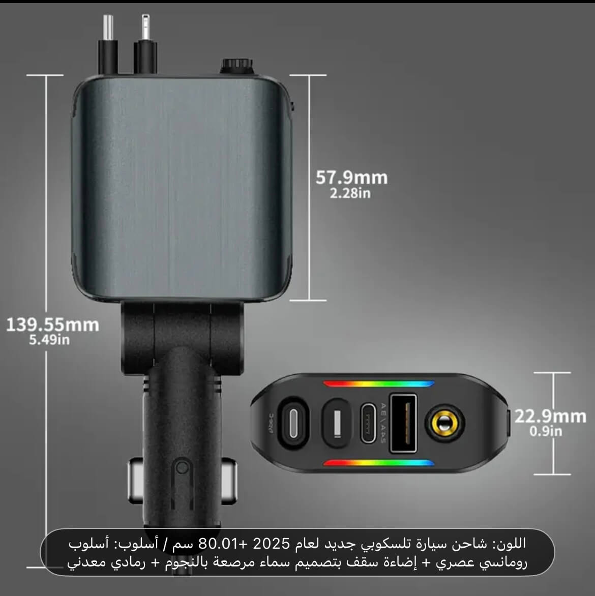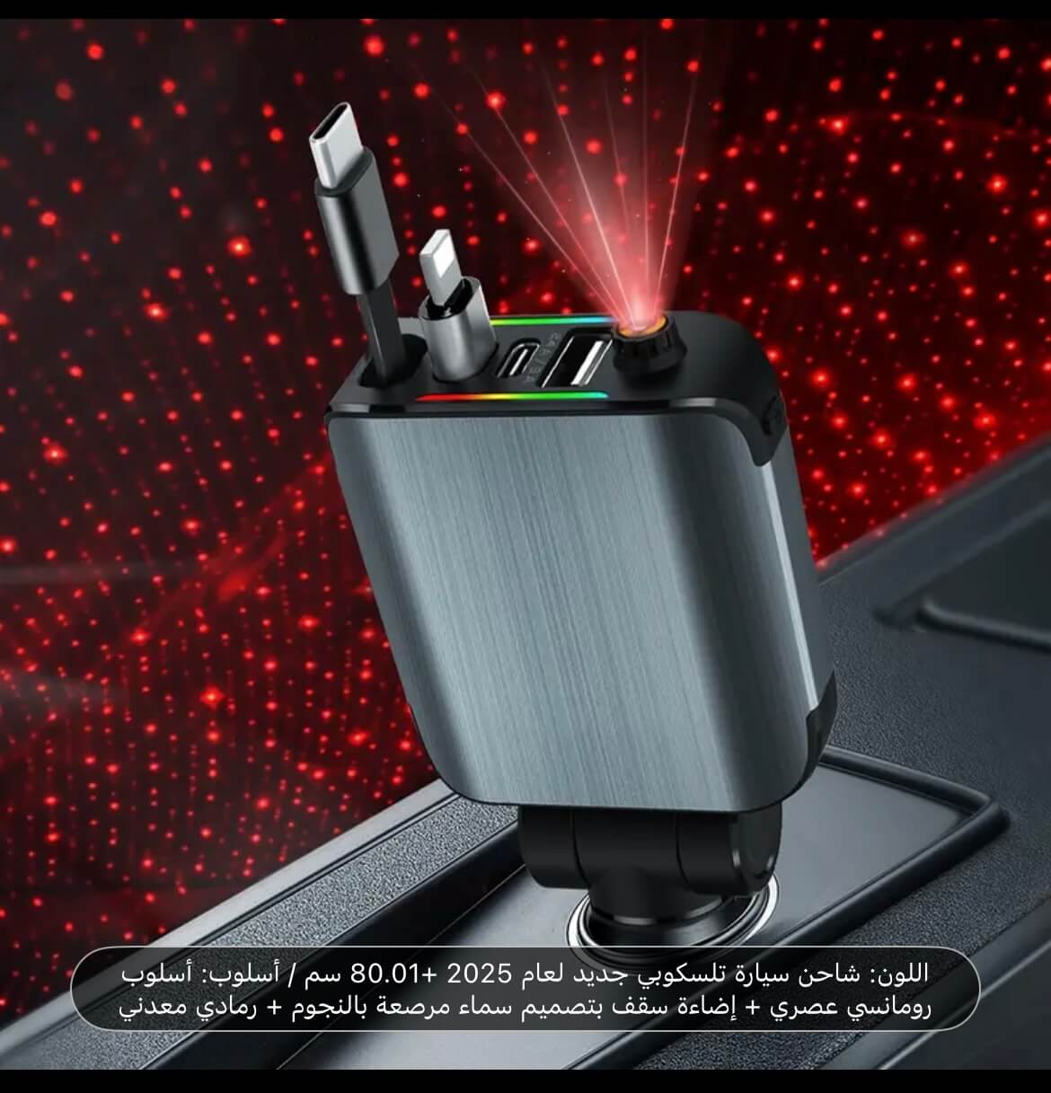 شاحن سيارة تلسكوبي ملون جديد لعام 2025، 80.01 سم، أنيق وعصري + إضاءة سقف بتصميم سماء مرصعة بالنجوم + معدني رمادي