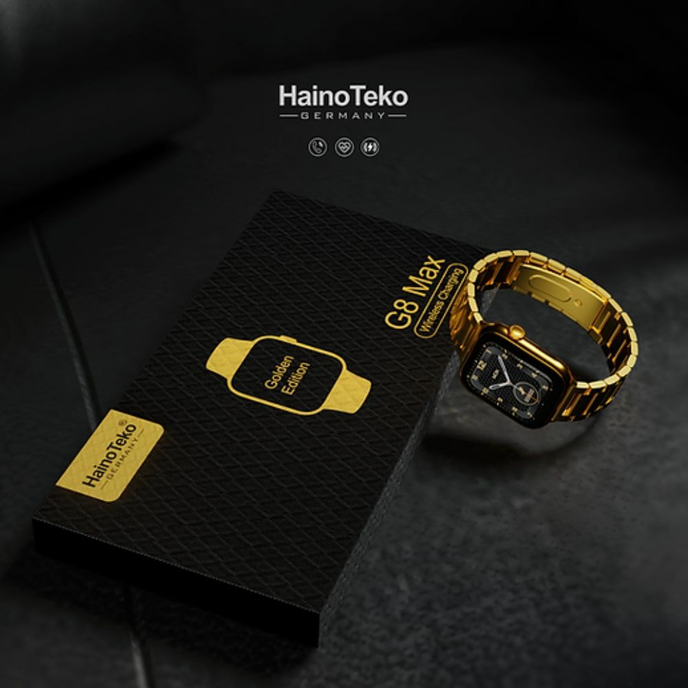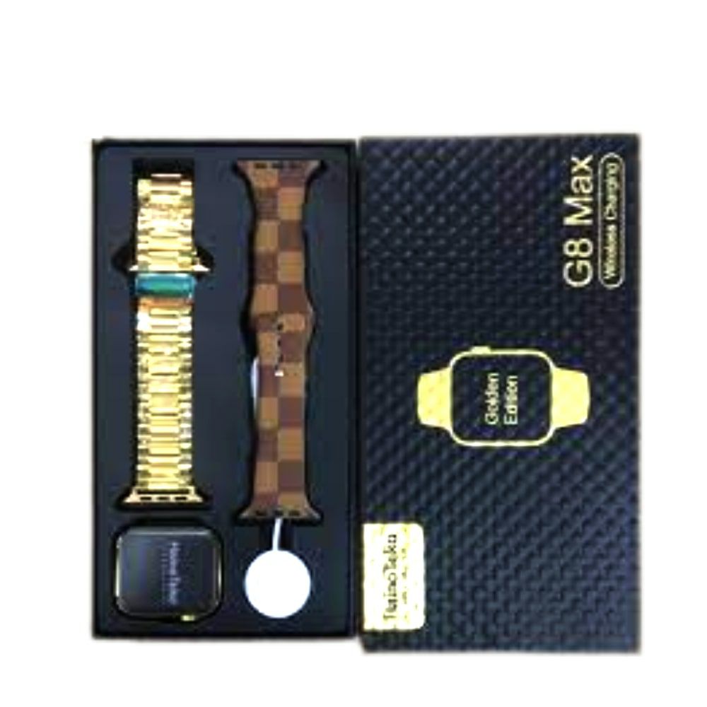 اللون الأسود مع الإصدار الذهبي اتصال بلوتوث حجم الشاشة ٤٥ ملم تصميم مقاوم للماء سعة البطارية 45 يومًا في وضع الاستعداد مكالمة بلوتوث يأتي مع حزامين الماركة: Haino Teko الموديل: G8 Max
