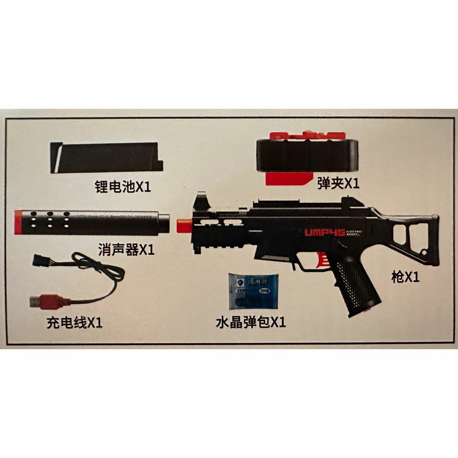 a description The UMP45 submachine gun fires soft Orbeez bullets and comes with a battery. The Orbiball machine toy is designed for children, all you have to do is load the cartridges into the magazine, turn the handle and the game begins, it is a completely safe weapon, the firing range reaches about 35 meters, the set includes a soft-bullet weapon itself (Orbiball), it must be planted In the water for approximately 3 -5 hours to its maximum size, a sight with which you can increase the shooting target, a charger, the machine comes disassembled, even a small child can assemble it, instructions are also included in the kit. If you want to give your child something new from weapons, this machine gun is perfect for you. A cool new electric submachine gun with hydrogel bullets that everyone dreams of. Fires automatically when the trigger is pressed; For category 5+; Shooting distance up to 35 m.