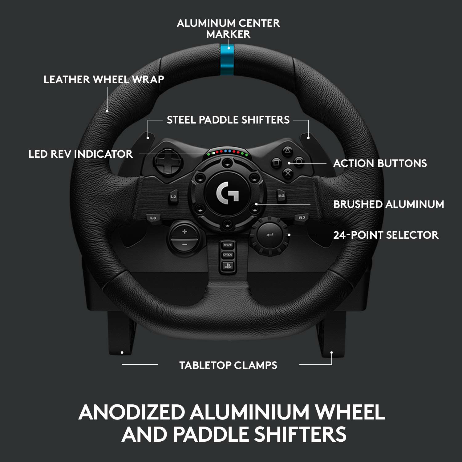 Therefore, it may contain some scratches or some dust SPECS & DETAILS DIMENSIONS WHEEL PHYSICAL SPECIFICATIONS Height: 10.63 in (270 mm) Width: 10.24 in (260 mm) Depth: 10.94 in (278 mm) Weight without cables: 4.96 lbs (2.25 kg) PEDALS PHYSICAL SPECIFICATIONS Height: 6.57 in (167 mm) Width: 16.87 in (428.5 mm) Depth: 12.24 in (311 mm) Weight without cables: 6.83 lbs (3.1 kg) TECHNICAL SPECIFICATIONS WHEEL TECHNICAL SPECIFICATIONS Rotation: 900 degrees lock-to-lock Hall-effect steering sensor Dual-Motor Force Feedback with TRUEFORCE Overheat safeguard PEDAL TECHNICAL SPECIFICATIONS Nonlinear brake pedal Patented carpet grip system Textured heel grip Self-calibrating MATERIALS Wheel spokes: Anodized aluminum Wheel cover Hand-stitched leather Steering shaft: Steel Shifter paddles: Brushed stainless steel Mounting clamps: Glass-filled nylon Pedal frames and arms: cold rolled steel Pedal piston sleeves: Polyoxymethylene thermoplastic (POM) WARRANTY INFORMATION 2-Year Limited Hardware Warranty PART NUMBER Black Xbox Series X|S /Xbox One/PC : 941-000156 Black PS5 /PlayStation /PC : 941-000147 COMPATIBILITY REQUIREMENTS (XBOX SERIES X|S AND XBOX ONE) Xbox Series X|S or Xbox One game system Game that supports Logitech force feedback racing wheel 1For a list of supported games, visit logitechg.com/support/g923-xb1 REQUIREMENTS (PLAYSTATION 5 OR PLAYSTATION 4) PlayStation 5 or PlayStation 4 system Game that supports Logitech force feedback racing wheel. 2For a list of supported games, visit logitechg.com/support/g923-xb1 REQUIREMENTS (PC) Windows® 11 or Windows 10 150 MB of available hard disk space USB 2.0 port Game that supports Logitech force feedback racing wheel. 3For a list of supported games, visit logitechg.com/support/g923-xb1 IN THE BOX Steering wheel Pedals Power supply User documentation SUPPORT Find all the documentation we have available to get this product up and running quickly. GET STARTED REGISTER A PRODUCT VIEW FAQS VIEW ALL DOWNLOADS FILE A WARRANTY CLAIM REQUEST SUPPORT