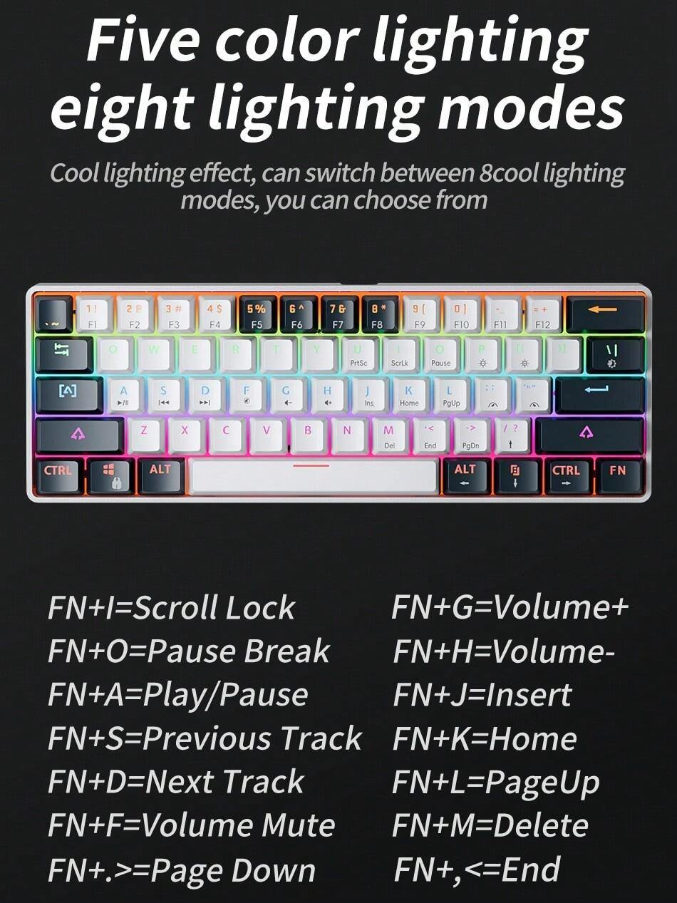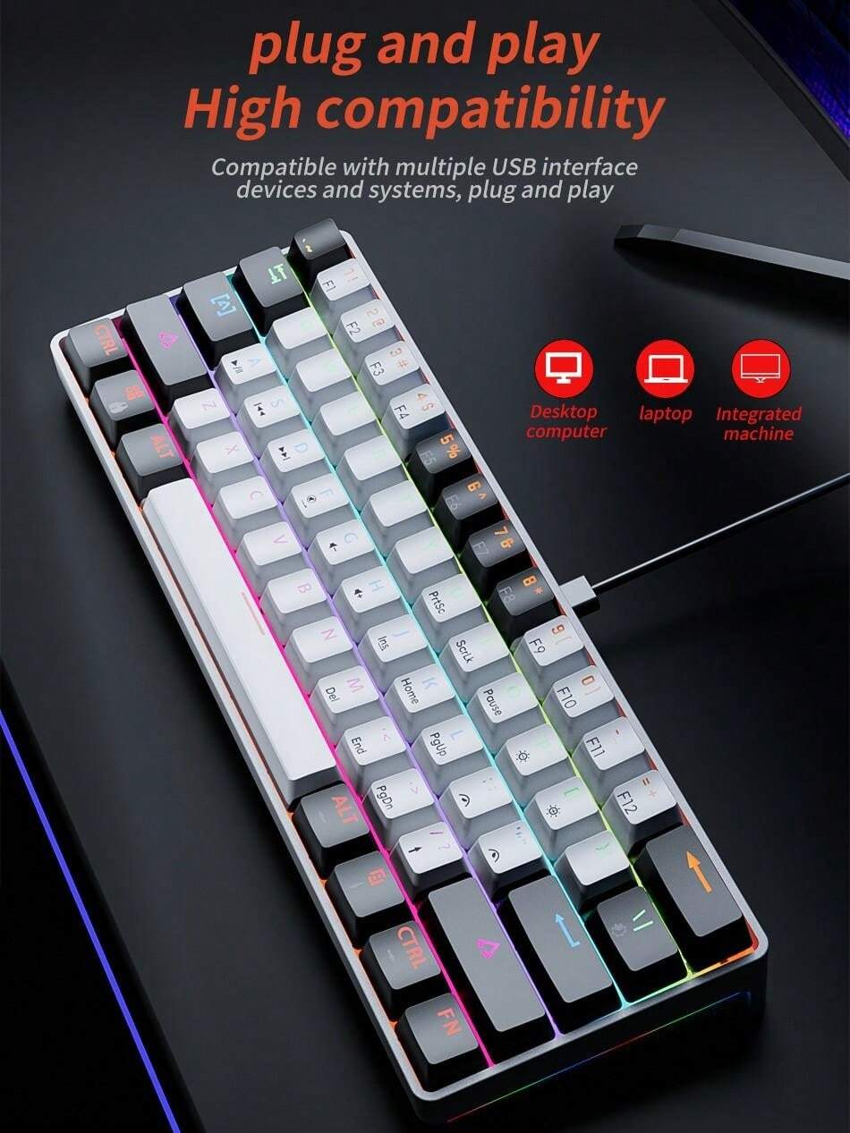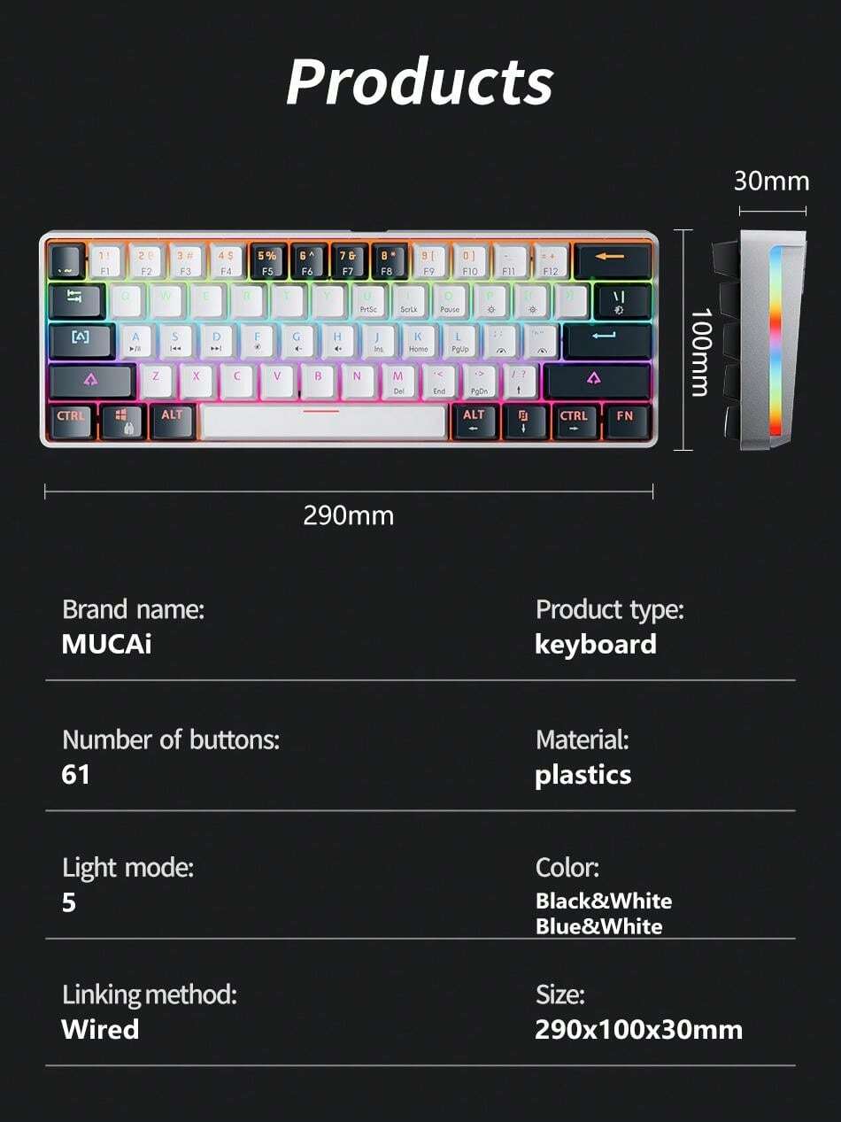 a description Material: Resin Compatible devices: PC, Laptop, Mac Keys quantity: 61 keys Colour: black and white Function: Games Connector: Type C Certification: CE, FCC Batteries included: No Power supply: USB power cable Battery type: None