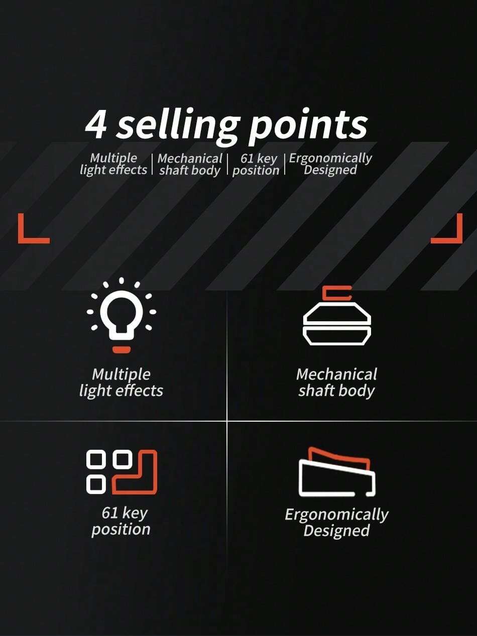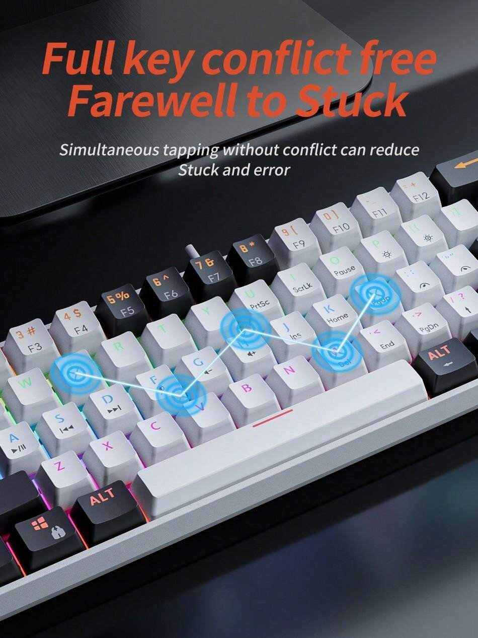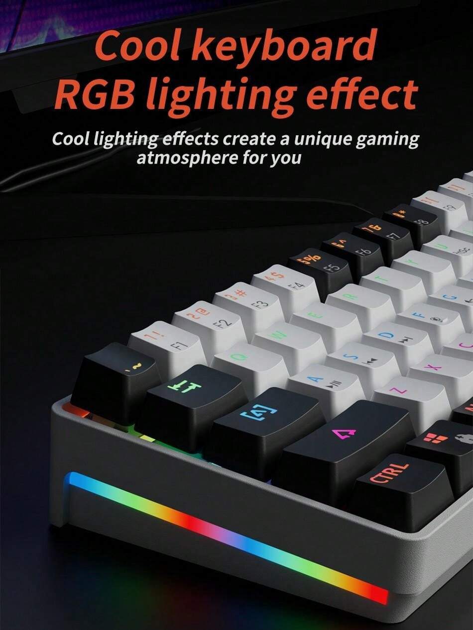 a description Material: Resin Compatible devices: PC, Laptop, Mac Keys quantity: 61 keys Colour: black and white Function: Games Connector: Type C Certification: CE, FCC Batteries included: No Power supply: USB power cable Battery type: None
