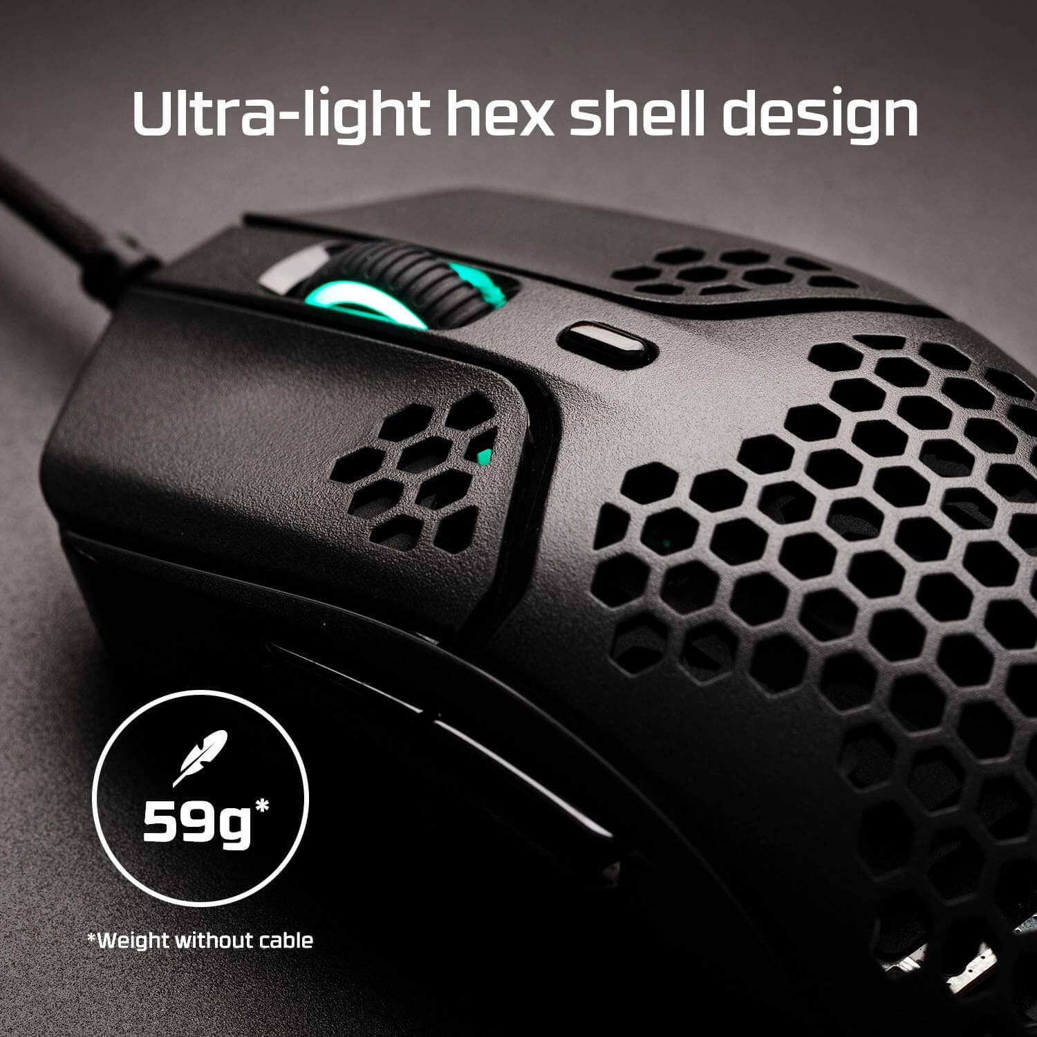 Brand HyperX Color Black Connectivity Technology USB Special Feature Programmable Buttons, Lightweight Movement Detection Technology Optical About this item:- Ultra-light hex shell design: The honeycomb shell provides feather-light weight without sacrificing durability. HyperFlex USB Cable: The light, flexible paracord material reduces tension and resistance for easier mouse movement. TTC Golden micro dustproof switches: These switches provide solid, satisfying clicks and are rated for 60 million clicks. Pure virgin-grade PTFE skates: The low-friction 100% PTFE skates help provide an easy, effortless glide. Grip tape included: For more control and comfort, grip tape for the sides and left and right buttons are included. Customizable with HyperX NGENUITY Software: Easily customize DPI settings, RGB lighting, button assignments, and record macros with powerful, easy-to-use, HyperX NGENUITY Software.