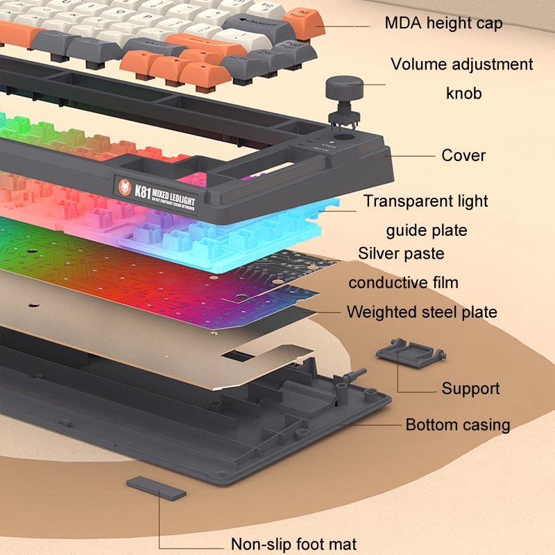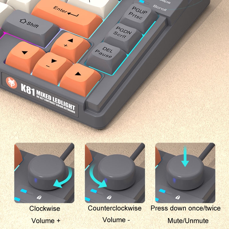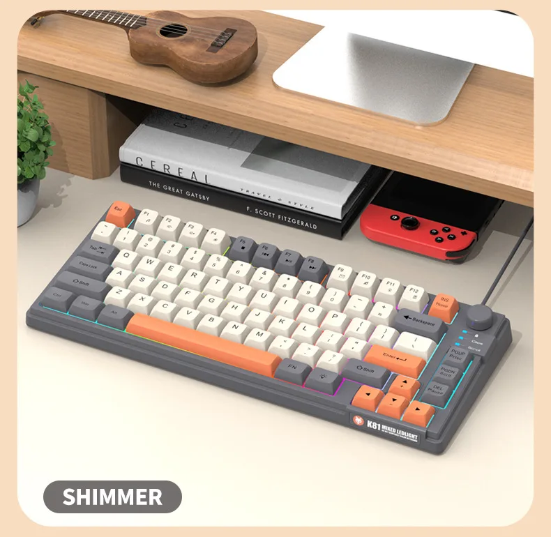 Description Compatible Devices: PC, Laptop Keys Qty: 85 Keys Color: K81 Shimmer Material: ABS Certification: CE Batteries Included: No Power Supply: USB Power Cord Battery Type: None Connectivity Technology: Wired Backlight Type: RGB Lighting Keyboard Types: Membrane Keyboard