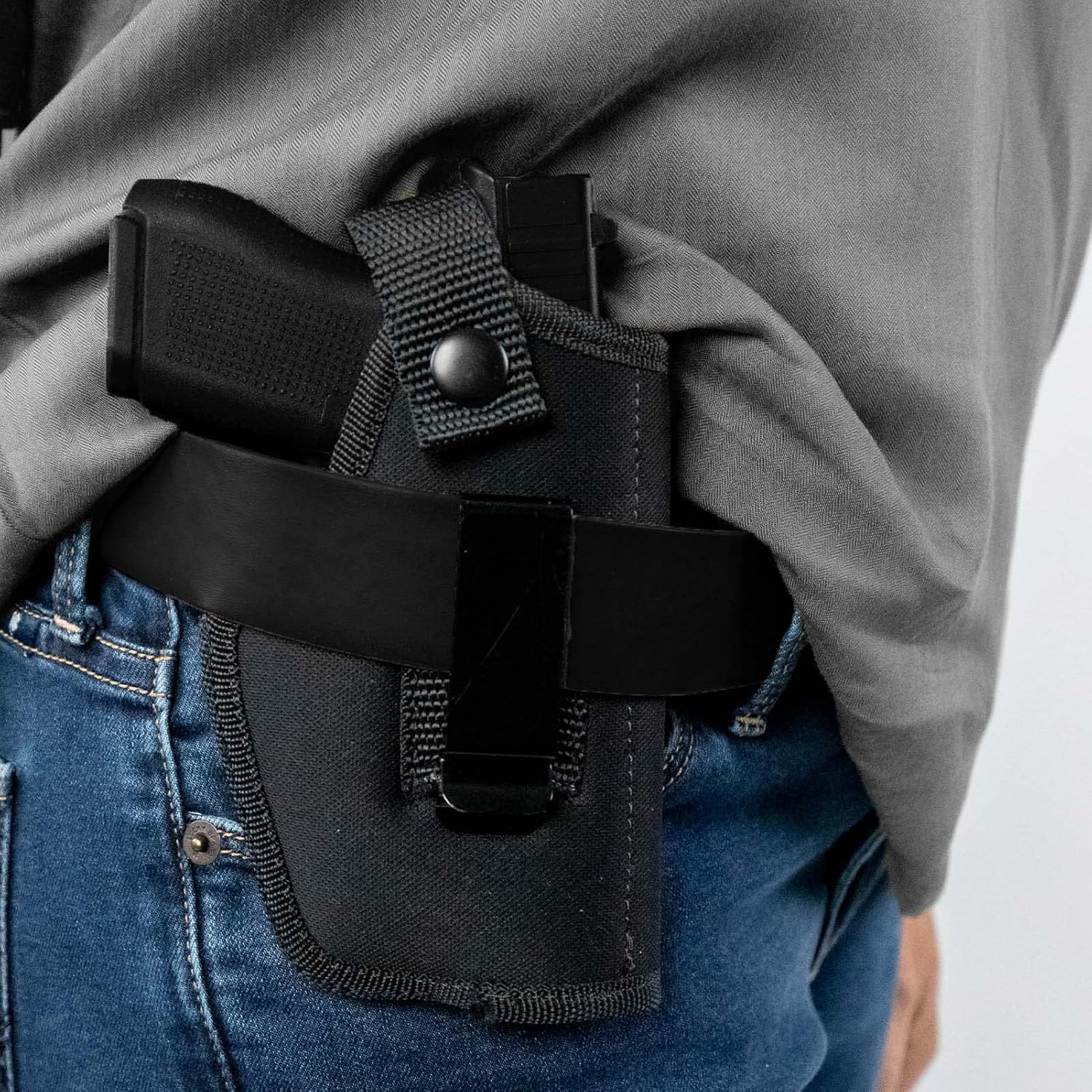 Colour: black Material: polyester Composition: 100% polyester About this item ! Comfortable: A foam layer on these gun holsters for pistols helps ease carrying discomfort, whether you're running errands or taking a late-night stroll COMPATIBLE WITH MOST 380 PISTOLS - Compatible with S&W Bodyguard, Ruger LCP, Kel Tec P3AT, Kahr P380, NAA Guardian, Micro Desert Eagle, and any pistol with a slide length between 4 - 5" Long Sturdy: From the heavy-duty belt clip to the metal snap, each component in our holsters for concealed carry is constructed for optimal durability Secure: A nylon retention strap on the right-handed OWB and IWB holster in extra small helps keep your firearm in place when not in use Versatile: Carry your gun your way; our concealed carry holster for men and women can be worn at the hip, open carry style, and in other positions