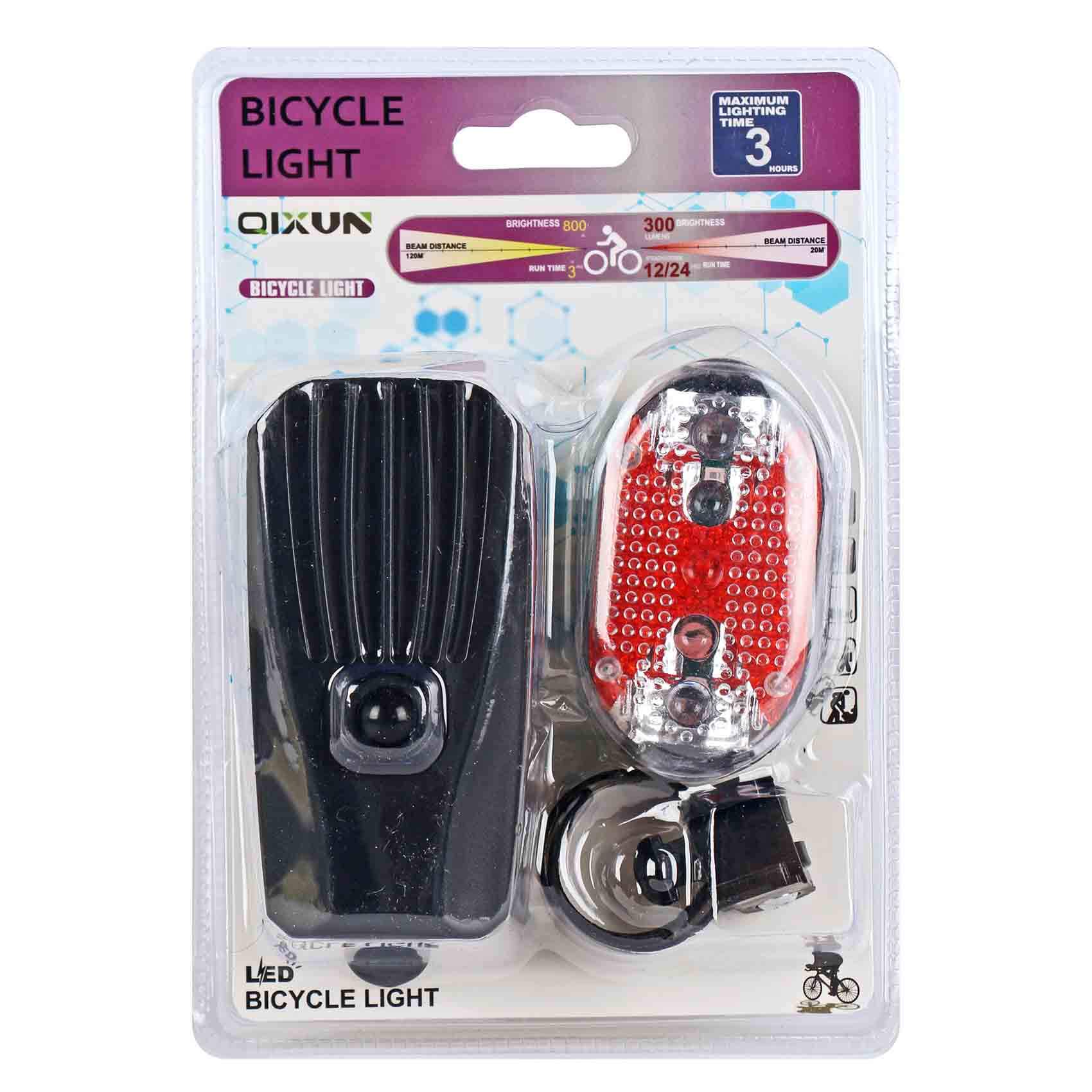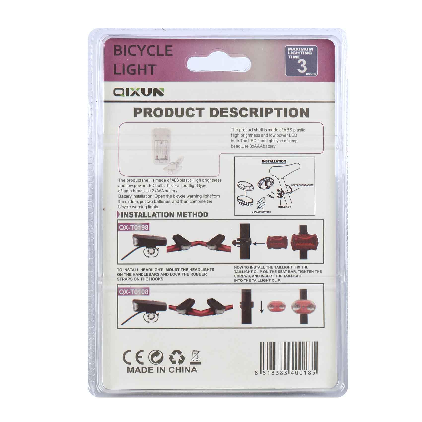 PRODUCT DESCRIPTION The product shell is made of ABS plastic High brightness and low power LED hulb. The LED floodlight type of lamp bead Use 3xAAAbattery INSTALLATION The product shell is made of ABS plastic, High brightness and low power LED bulb. This is a floodlight type of lamp bead Use 2xAAA battery Battery installation: Open the bicycle warning light from the middle, put two batteries, and then combine the bicycle warning lights. INSTALLATION METHOD SEAT POST BRACKET 2AAA BATTERY BRACKET QX-T0198 TO INSTALL HEADLIGHT: MOUNT THE HEADLIGHTS ON THE HANDLEBARS AND LOCK THE RUBBER STRAPS ON THE HOOKS QX-T0108 HOW TO INSTALL THE TAILLIGHT: FIX THE TAILLIGHT CLIP ON THE SEAT BAR, TIGHTEN THE SCREWS, AND INSERT THE TAILLIGHT INTO THE TAILLIGHT CLIP