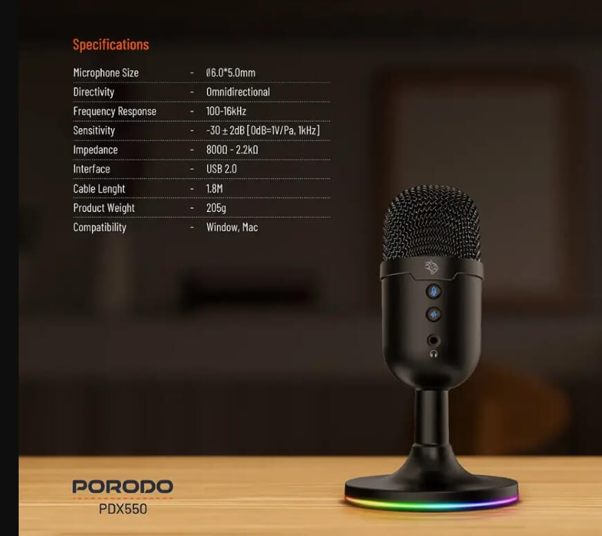 The Porodo Gaming Omni-Directional USB Microphone represents a high-class integrated audio solution that targets computer game players, streamers, and content producers alike. Boasting -32±2dB of sensitivity with an expansive range in frequency between 100Hz to 16KHz, this microphone achieves the most professional clarity in delivering clear sound or recorded voice within games. The 360° omnidirectional design assures consistent sound intake from all sides and is thus perfect for group discussions or immersive game sessions. This device comes with a convenient mute button, has push-activated noise cancellation for the crispest possible audio, and is customizable with RGB lighting to suit your setup. Compatible with both Windows and Mac operating systems, it's plug-and-play via USB 2.0 with a length of 1.8 m for flexible positioning. Compact but mighty, the Porodo Gaming Microphone combines functionality and style into one device that will address all your audio needs