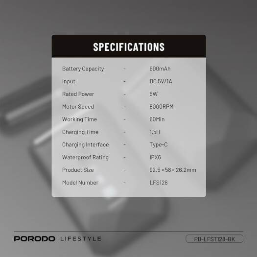 The Porodo Lifestyle Dual-Blade Pocket Shaver pairs convenience with functionality for a clean shave on the move. Fitted with a 600mAh battery, it provides up to 60 minutes of usage following a fast 1.5-hour charging via the Type-C charging port. Its high 8000RPM motor offers a quick and effective shave with every use.The shaver is compatible with wet and dry use and, therefore, versatile enough for any user preference. It is simple to clean thanks to its IPX6 wash rating, and its travel lock ensures it cannot turn on accidentally when stored. The shaver is 5W rated for power, but despite its small size, it cuts precisely and is excellent for use when traveling or on a daily basis.The 5V/1A input DC makes easy recharging convenient, so you're always ready for your next shave. Porodo Lifestyle Dual-Blade Pocket Shaver is your ideal grooming companion, bringing performance and convenience in a single sleek package.