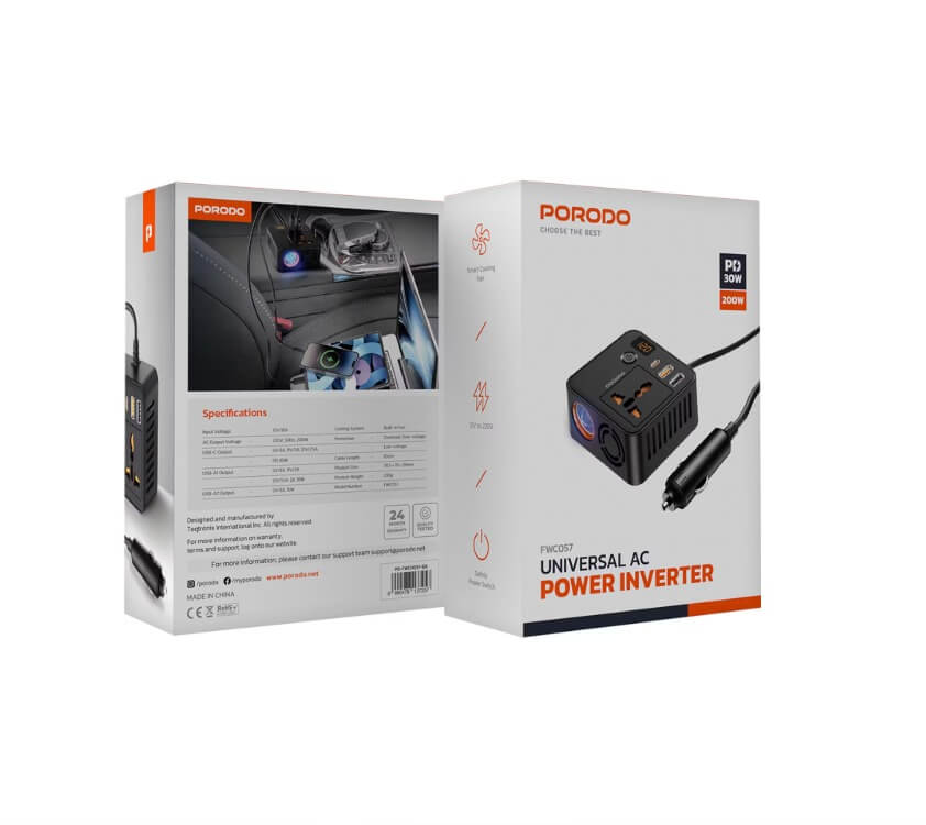 The Porodo Universal AC Power Inverter is a dependable and adaptable gadget made to efficiently and securely power your necessary equipment. It can continuously produce up to 200W of electricity by converting a 12V input voltage to a steady 220V AC output at 50Hz. The inverter protects your gadgets during use. It includes features for overload, over-voltage, and low-voltage safety. It features a USB-C output that offers power delivery up to 30W. Plus, there are two USB-A outputs. One is Quick Charge compatible and can deliver up to 18W. The other provides 5V/3A, totaling 15W. The gadget has a built-in fan that helps it stay cool. This smart cooling system keeps the temperature steady and stops overheating. As a result, it can last longer. Additionally, the inverter has a 65cm wire for flexible placement and a safety power switch. The Porodo Universal AC Power Inverter, which features improved protection, different charging options, and intelligent cooling, provides consistent performance for a wide range of electronic devices.