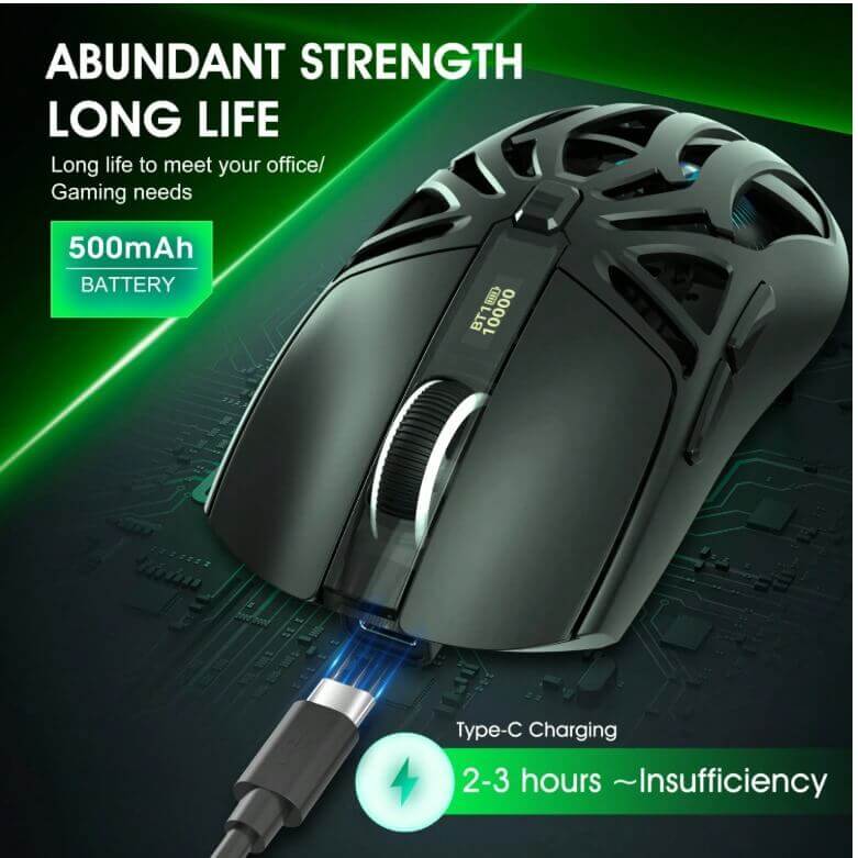 The mouse comes with a built-in rechargeable battery via a Type-C port, providing long-term use with fast and efficient charging.
