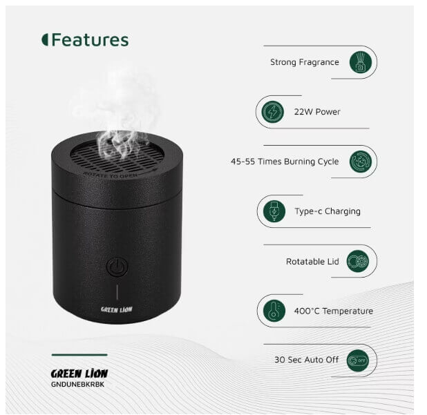 The Green Lion Dune Incense Burner is a simple, modern way to burn incense that lasts. Engineers crafted it from durable PA66 and nylon, building it to withstand heat while maintaining its lightweight nature. With a 2000mAh battery, you can enjoy 45-55 burning cycles on a single charge. It heats up to 300-400°C in a short time and releases strong fragrances in 30 seconds. The locking base and lid design are easy to use, while the auto-off function prevents burnouts by shutting off after each cycle. Charging is quick and easy with the Type-C port, and it only takes a few minutes to turn on. The included tongs help handle the incense, making the experience easier. Operating at 4.2V and 22W, the incense burner delivers a consistent burn every time. The Green Lion Dune Incense Burner delivers a classic aroma. You can use it at home, in the office, or anywhere else. Its design is smart and modern. Show Less