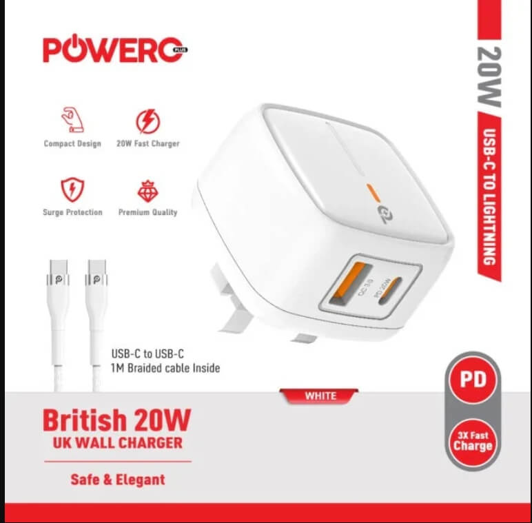 Powero+ British 20W UK Wall Charger with Type-C to Type-C Cable