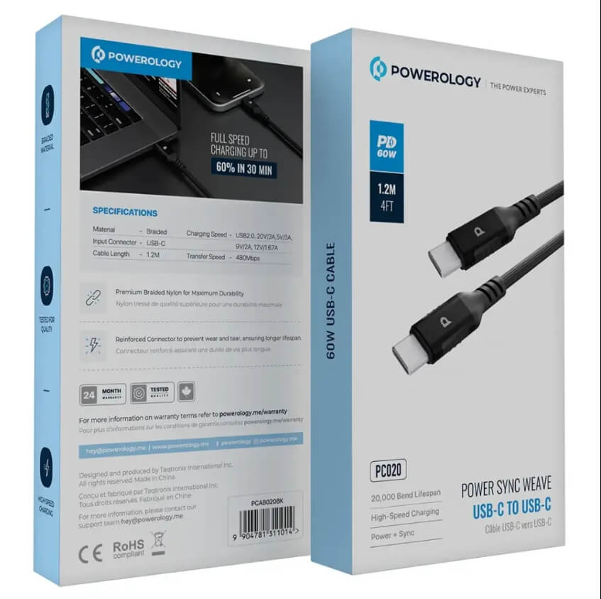 The Powerology Power Sync Weave USB-C to USB-C PD 60W cable boasts features for elevated fast charging and data transfer rates. Constructed with an enmeshed braided material, this 1.2m cable boasts strength and durability because it can sustain 20,000 bends. It supports USB 2.0 data transfer speeds of 480Mbps and impressive charging speeds of 20V/3A, 5V/3A, and 12V/1.67A, with the capacity to deliver 60 watts of power. It has been built to be supported in power and synchronization, which means you can charge and transfer files simultaneously. Tested for quality and durability, ensuring promising performance with USB-C devices; whether for everyday or heavy charging, a high-quality, long-capable charging, and syncing solution from Powerology is the one to stake on: the Power Sync Weave!