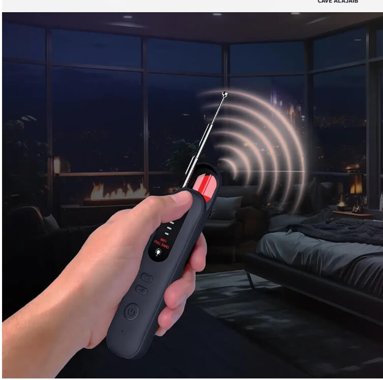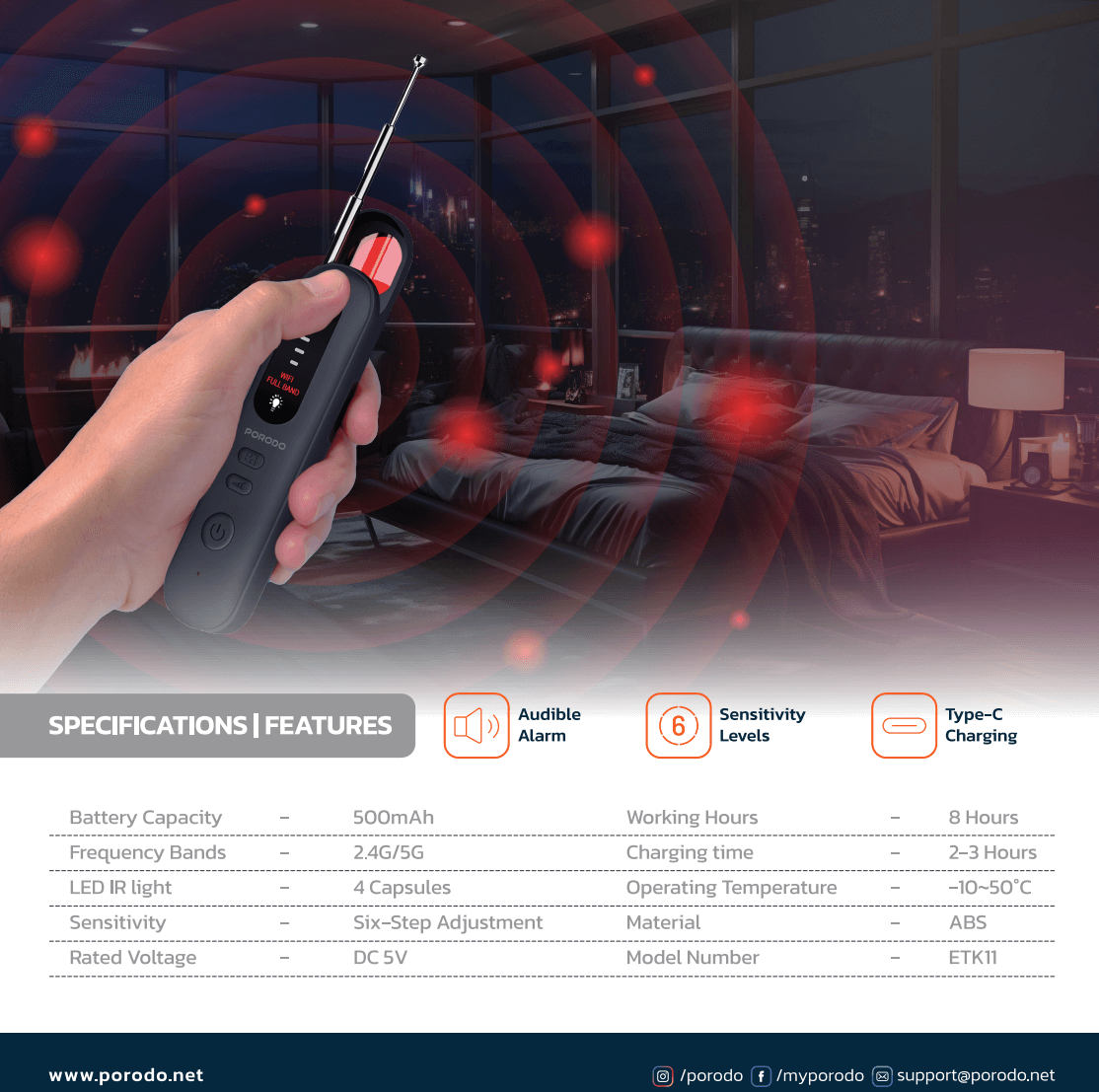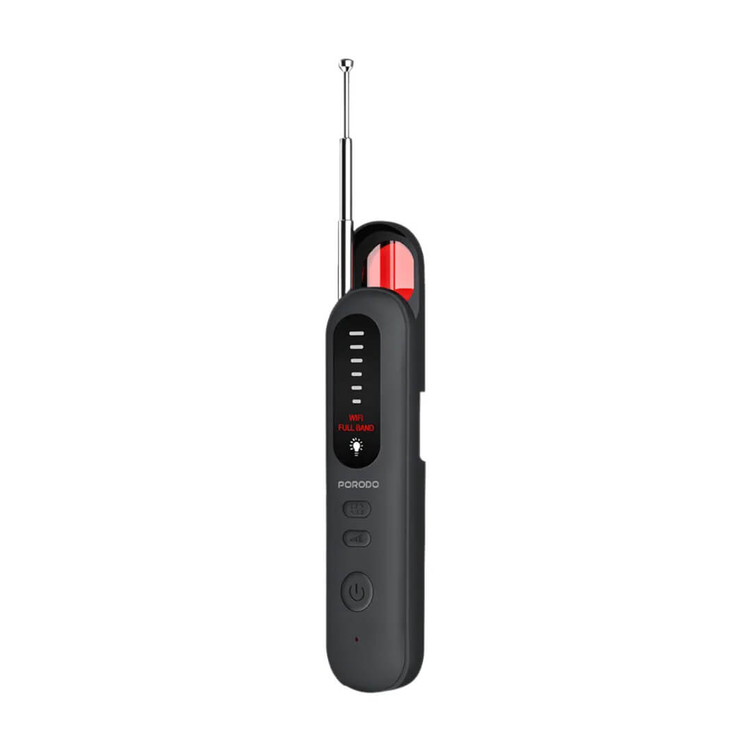 Description: The Porodo SpyGuard Wireless Night Vision Camera Detector, Black, is a compact device designed for detecting meeting rooms and inaudible wireless cameras. Powered by a 500mAh battery, it can be used for 8 hours continuously and can be recharged in 2-3 hours via a Type-C cable. It detects frequently encountered bands such as 2.4G and 5G, using four infrared LED light capsules for precise detection. The device comes with adjustable ranges and can be customized to suit your preferences. It has a temperature range of -10 to 50°C. Detection is accompanied by audible alarms, making it ideal for providing privacy in any environment. Spy Guard Wireless Camera and Storytelling Device - Black