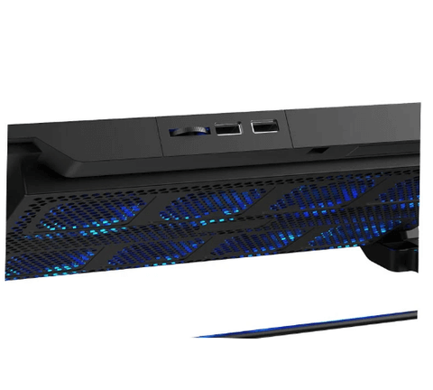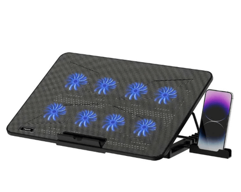 The Porodo Gaming 8-Fan Ergonomic Laptop Cooling Stand with Built-in Phone Slot is designed to elevate both your gaming and working experience. It keeps your laptop cool during intense gaming or heavy use. This is thanks to eight powerful fans that spin at 2600 RPM. You can adjust the stand for the best viewing angle. It has seven tilt options for comfort. Dual USB-A ports let you connect more devices easily. The anti-slip stability keeps everything in place, even during intense gaming sessions. The cooling stand is long-lasting and provides effective airflow, thanks to its sturdy ABS and iron mesh construction. The integrated phone slot keeps your phone close, whether for notifications or gaming. This cooling stand is practical and energy-efficient. It delivers great cooling without extra adapters, using a DC 5V USB-A power input. With the Porodo Gaming 8-Fan Ergonomic Laptop Cooling Stand, you can stay cool and play longer.