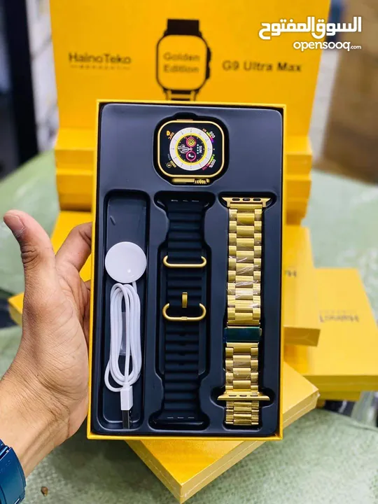 Specifications. . . . HD Display Colour Black With Golden Edition Connectivity Bluetooth Screen Size 45 mm Bluetooth Call Comes with 2 straps Brand: Haino Teko Model: G9 Ultra Max Bluetooth Calling Wireless Charging Heart rate monitoring 2.2 Inch Display Customize watch Faces 11 Sets Menu heart rate monitoring Pedometer calorie consumption Exercise mileage record Sedentary reminder Sleep Monitoring Blood pressure monitor Weather Forecast Contact Sync BT Music Control Multi Language Support Calculator Alarm Brightness adjusting Compatibility - Android and iOS Fast wireless charging High capacity battery, it will give you long time Bluetooth Call and Smart Notification You Will Get in Your Hand NFC Access Control, Body Temperature Measurement, AlI Voice Assistant, Atmospheric Pressure Monitoring Multiple Standby Watch Faces and also You Can Make Your Own You can enjoy games on your wrist