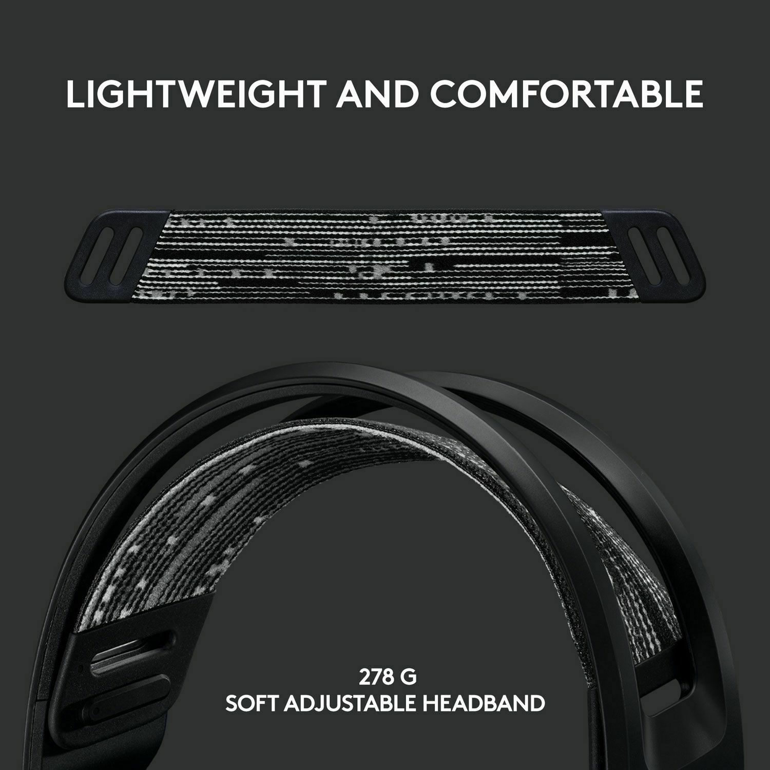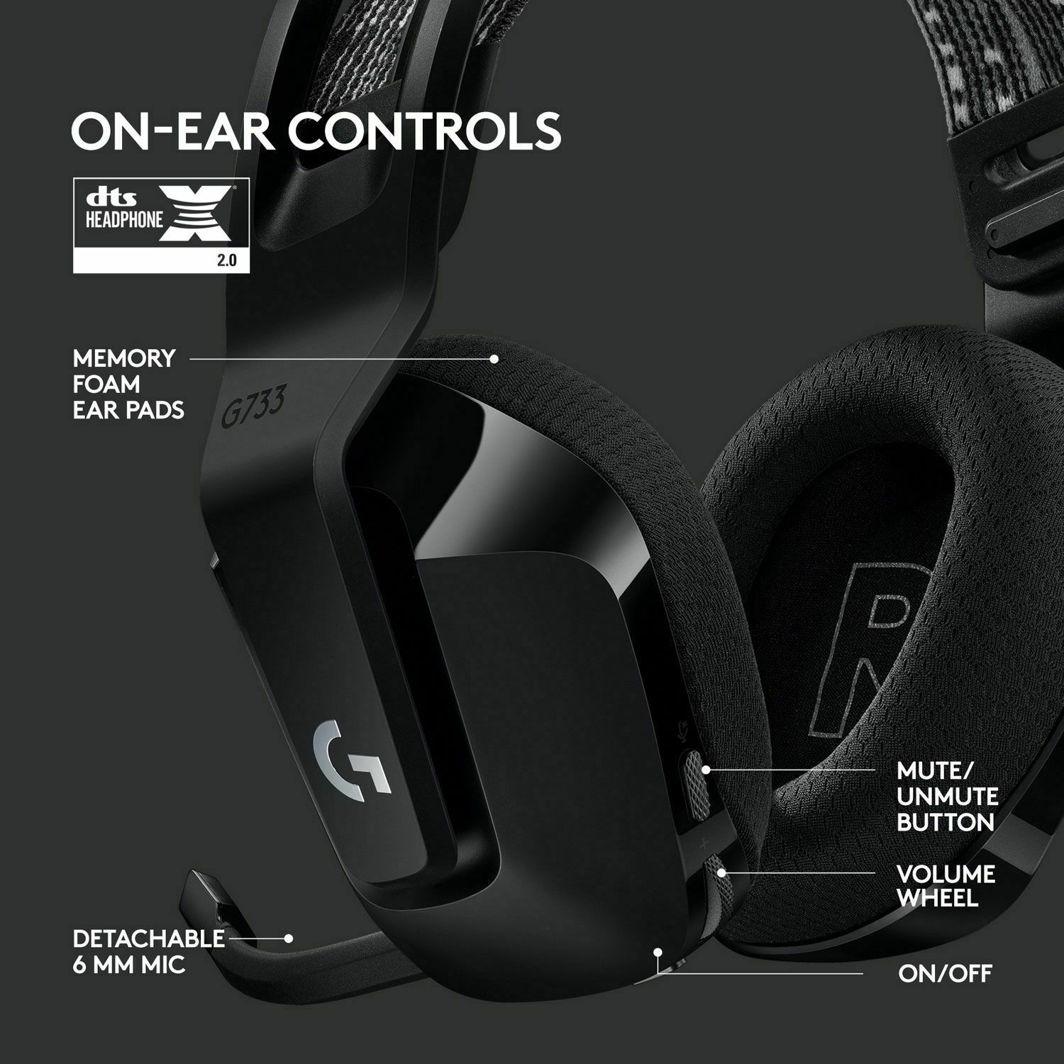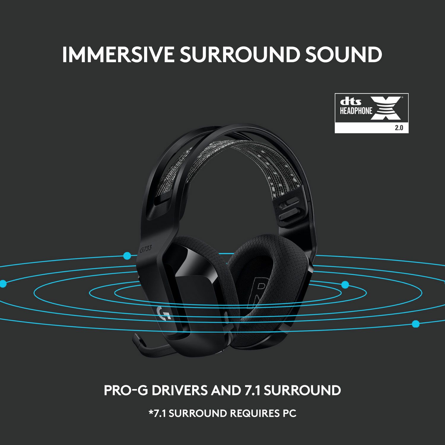Meet G733, a gaming headset designed to suit your style. Embrace total wireless with 2.4 GHZ LIGHTSPEED wireless, featuring up to 20 m of range and up to 29 hours of battery life. Customize how you look and sound in G HUB with dual-zone, front-facing LIGHTSYNC RGB and Blue VO!CE real-time voice filters. G733 features advanced audio technologies, including 40 mm PRO-G audio drivers, internal acoustic chambers, and DTS Headphone:X 2.0. Play your way with four colorways to choose from and play with comfort with a comfortable, reversible headband, dual-layer memory foam earcups, and a lightweight headset that weighs just 278 g. Total freedom with up to 20 m wireless range and LIGHTSPEED wireless audio transmission. Keep playing for up to 29 hours of battery life.1 Play in stereo on PlayStation(R) 4..2 Personalize your headset lighting across the full spectrum, ~16.8M colors. Play in colors with front-facing, dual-zone LIGHTSYNC RGB lighting and choose from preset animations or create your own with G HUB software.3 Colorful, reversible suspension headbands are designed for comfort during long play sessions. Advanced mic filters that make your voice sound richer, cleaner, and more professional. Customize with G HUB and find your sound. Hear every audio cue with breathtaking clarity and get immerse in your game. PRO-G drivers are designed to significantly reduce distortion and reproduce precise, consistent, rich sound quality. Soft dual-layer memory foam that conforms to your head and reduces stress points for long-lasting comfort. G733 in Black weighs only 278 g for long-lasting comfort. Available in multiple colors. Each color with vibrant reversible headband and corresponding earpads. Console compatible: PlayStation 5, PlayStation 4, Nintendo Switch in Dock. (Stereo sound only via USB wireless dongle)