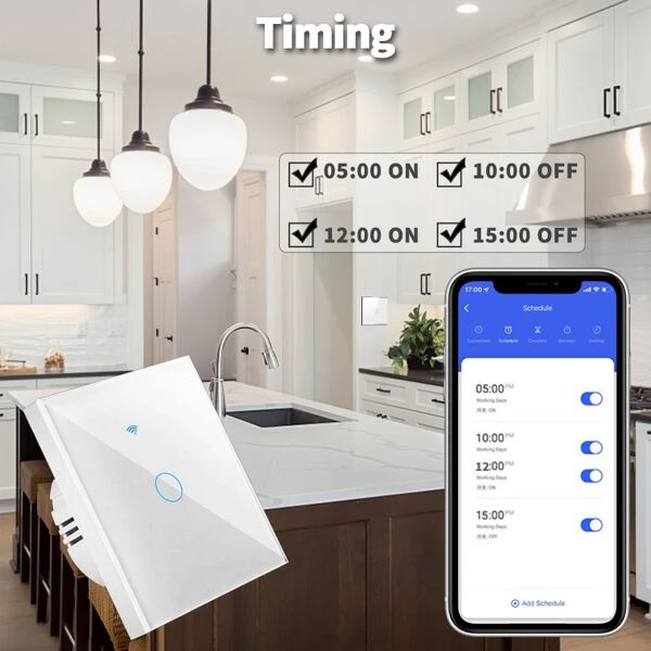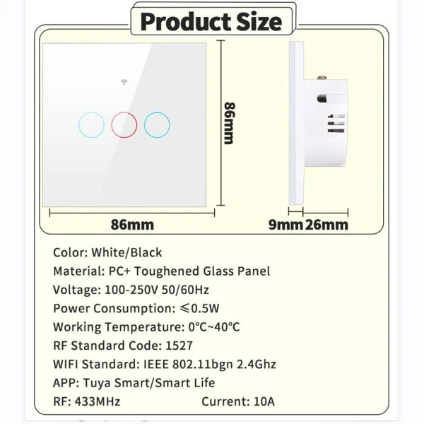 Wi-Fi Touch Feature Specifications Specifications maximum. Strom: 10A(switch) 16A(socket) Load: 1000W/gang Wireless consumer: ≥ 0.2W the above. Voltage: 90 ~ 250V Relative humidity: 10% ~ 93% Working temperature: -30°C ~ +70°C Certification: CE, ROHS WiFi frequency: IEEE802.11 b/g/n High Quality WiFi: 2.4GHz WiFi b/g/n Frequency: 433.92 MHz Application: Tuya/Smart Life Apple: Google Home, Amazon Exa Control Wire: Need a neutral wire Back light: on blue light off blue light (can be cancelled) Typical shape: round Switch box wall: Ø = 75mm, width = 71mm, depth ≥ 35mm Function: Our wifi touch screen can be controlled through your smartphone and all support Google Home, Amazon Alexa, and YouTube app. Lighting background: WIFI touch keypad with blue LED light on isolating panel for every type, including long range night vision at night. : The smart touch switch is compatible with electric LED, incandescent, halogen, fluorescent, and compact fluorescent lamps. Smart WiFi switch (Kido cord required). Installation: Connect 3 wires to hang the Wifi Wall Touch Switch into your wall box as below: For the wire taken or red (live) returned to the copper l or hole in the back of the device. For blue or black (neutral) the wire is returned to the copper letter N or hole N in the back of the device. The board can be reassembled to change the module part if necessary (tie wire). Application installation: Download the Tuya or Smart Life app on your smartphone or tablet. The app can be downloaded from the Apple App Store or Google Play, then your app pairs with Amazon Alexa or Google Home which you can wirelessly connect to your connection.