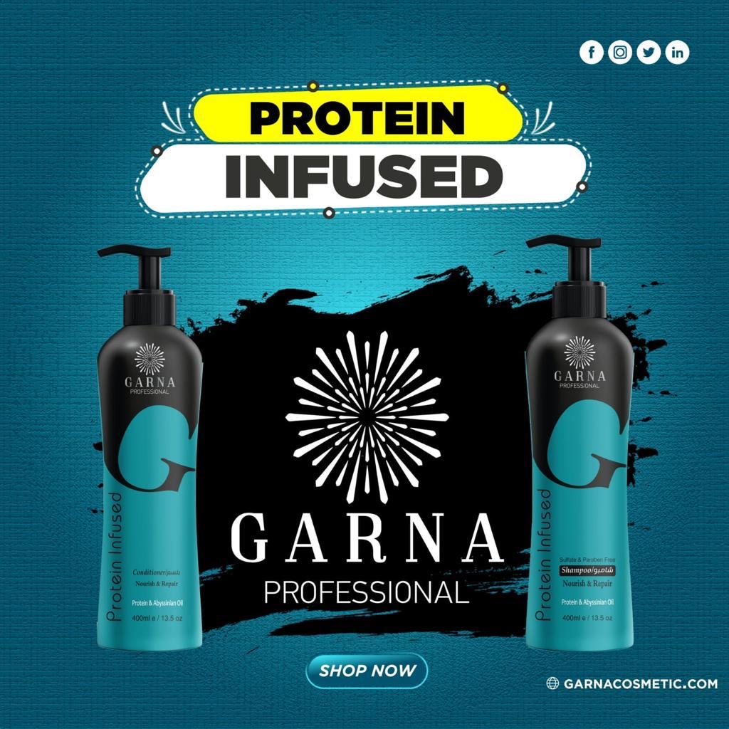 شامبو البروتين من غارنا تمت صياغته من البروتينات النباتية وزيت الحبشي الفاخر وزيت الغار الطبيعي لينظف الشعر بعمق ويحمية ويغذية