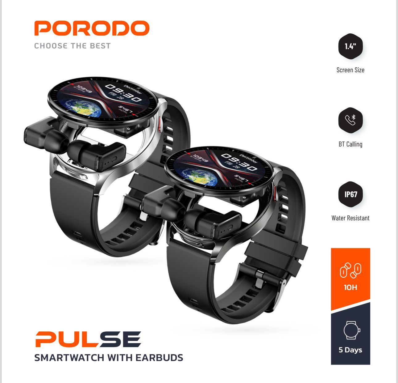تحديد سعة البطارية: 300 مللي أمبير (الساعة) 25 مللي أمبير (سماعات الأذن) وقت إعادة الشحن: 4 ساعات وقت عمل الساعة الذكية: حتى 5 أيام وقت عمل سماعات الأذن: 10 ساعات دقة الشاشة: 360 × 360 IPS ساعة ذكية شرائح: JL7012F6 توافق النظام: Android 5.0 وما فوق، iOS 10.0 وما فوق سمات حجم الشاشة 1.4 بوصة مكالمات بلوتوث IP67 مقاومة للماء الأشرطة الجلدية والسيليكون وصف ساعة Porodo Pulse الذكية مع سماعات الأذن هي حزمة من الابتكار والراحة والأناقة. ما ستحصل عليه هو ساعة ذكية أنيقة، مزودة ببطارية 300 مللي أمبير وشاشة IPS 360 × 360، بالإضافة إلى سماعات أذن موضوعة أسفل الشاشة، وتأتي مع أطراف أذن من السيليكون ومدعومة ببطارية 25 مللي أمبير. توفر الساعة الذكية ما يصل إلى 5 أيام من وقت العمل، بينما توفر سماعات الأذن 10 ساعات من وقت العمل. شاشة IPS عالية الدقة وشريحة JL7012F6 القوية، تجعل ساعة Porodo Pulse الذكية تقدم أداءً سلسًا وسريع الاستجابة لمجموعة متنوعة من الميزات مثل تتبع النشاط ومعدل ضربات القلب وتتبع السعرات الحرارية وعداد الخطى ومراقبة النوم وغيرها الكثير. لديك أيضًا حزام جلدي متضمن في العبوة، والذي يمكنك استبداله بحزام السيليكون وقتما تشاء. ابق على اتصال ومطلعًا ومستمتعًا مع ساعة Porodo Pulse الذكية المزودة بسماعات الأذن.