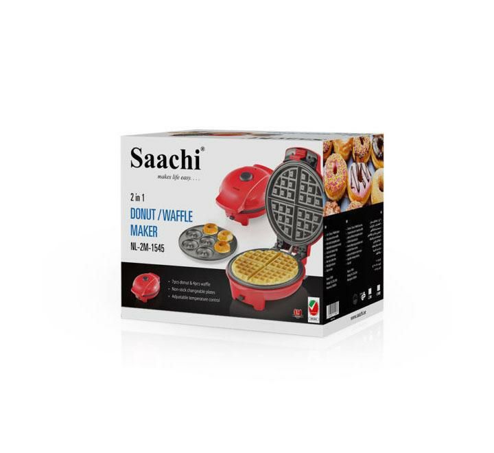 Enjoy delicious fluffy waffles and doughnut with the Saachi 2in1 Doughnut & Waffle Maker - Red, 1545. It is made of steel and non-stick changeable grids. Designed to make perfectly baked waffles and donut every time. Product Features: 7 pieces donut and 4 pieces waffle Adjustable thermostat Non-stick changeable plates Variable temperature control Cool touch plastic body Power cord storage Non-slip rubber feet Pilot light indicator Easy to clean Power: 700W Voltage: AC 220-240V Frequency: 50/60Hz Dimensions: 28.7 x 19 x 22.7 cm Weight: 2.20 Kg. The non-stick coating plates offer an easy to use and clean function, Preheats quickly, allowing you to get started in no time, Has non slip rubber feet which makes it to stand firm, Easy grip handle gives you a comfortable grip, Lightweight nature makes it easy to clean and store