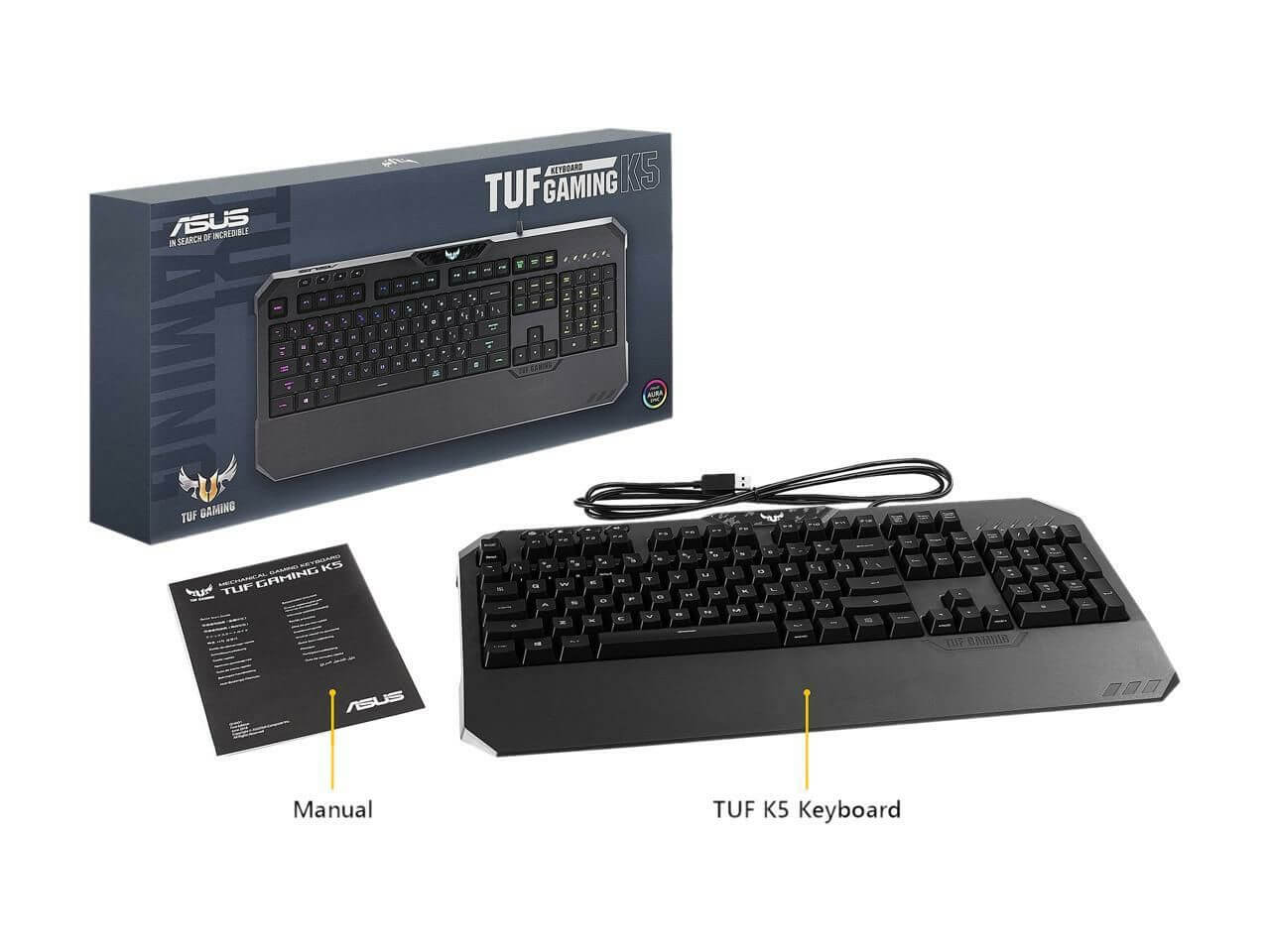 إضاءة AURA SYNC RGB تمنحك Aura Sync حرية تخصيص TUF Gaming K5 عبر خمس مناطق قابلة للتخصيص بشكل فردي، باستخدام طيف الألوان بالكامل وتأثيرات الإضاءة المتنوعة. تسمح أغطية المفاتيح ذات الخطوط الكبيرة بمرور المزيد من الضوء، بحيث تكون كل حرف ساطعة وسهلة الرؤية. ويتم مزامنة الإضاءة بسهولة مع نظام Aura Sync البيئي الشامل، لذا من السهل إنشاء وكر ألعاب فريد حقًا.