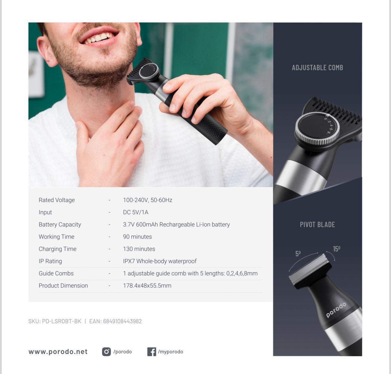-Guide Combs: 1 Adjustable Guide Comb With 5mm Lengths: 0,2,4,6,8mm -3.7V 600mAh Rechargeable Li-Ion Battery Capacity -IP Rating: IPX7 Whole-body Waterproof -130 Minutes Charging Time -90 Minutes Working Time