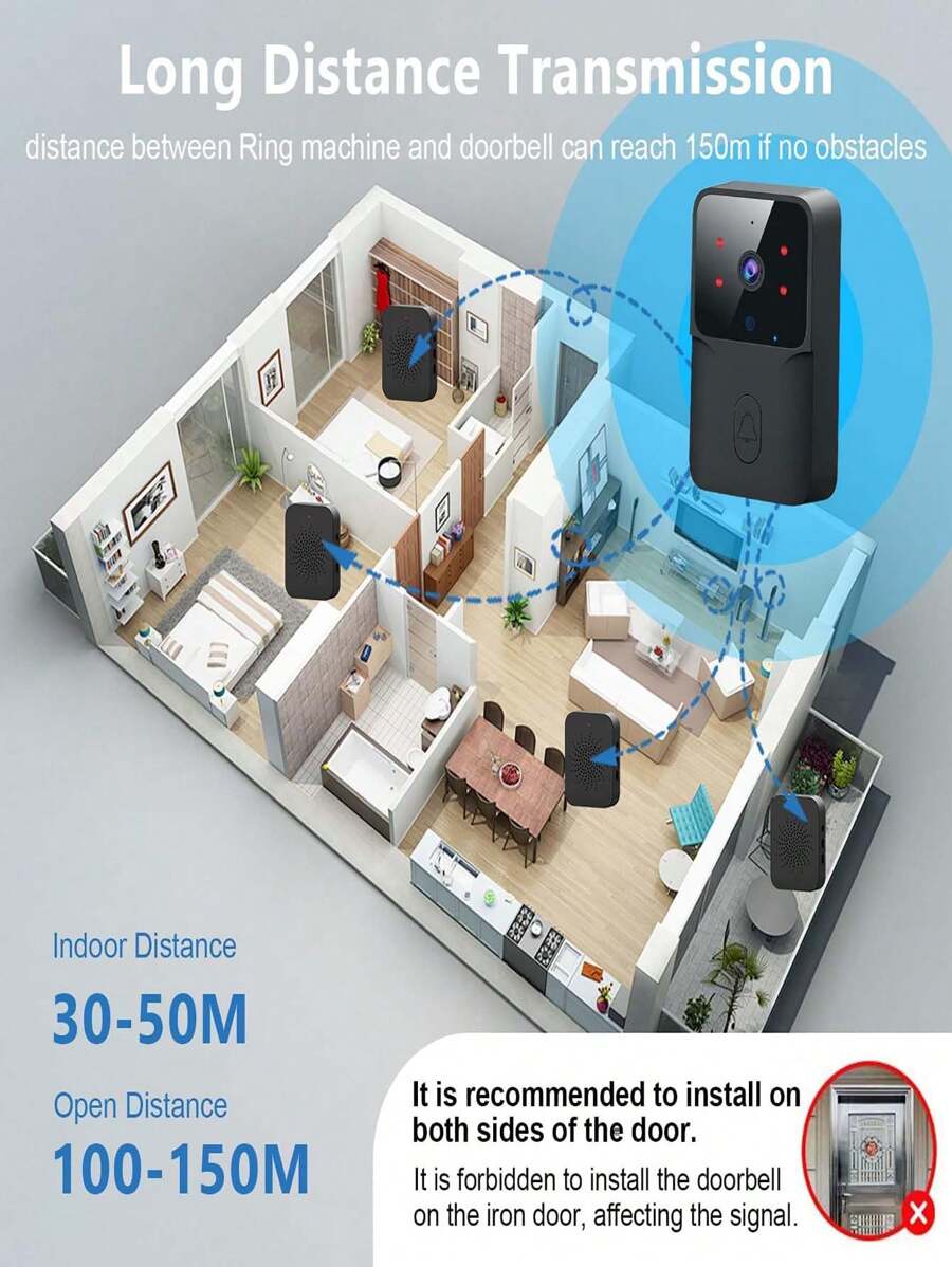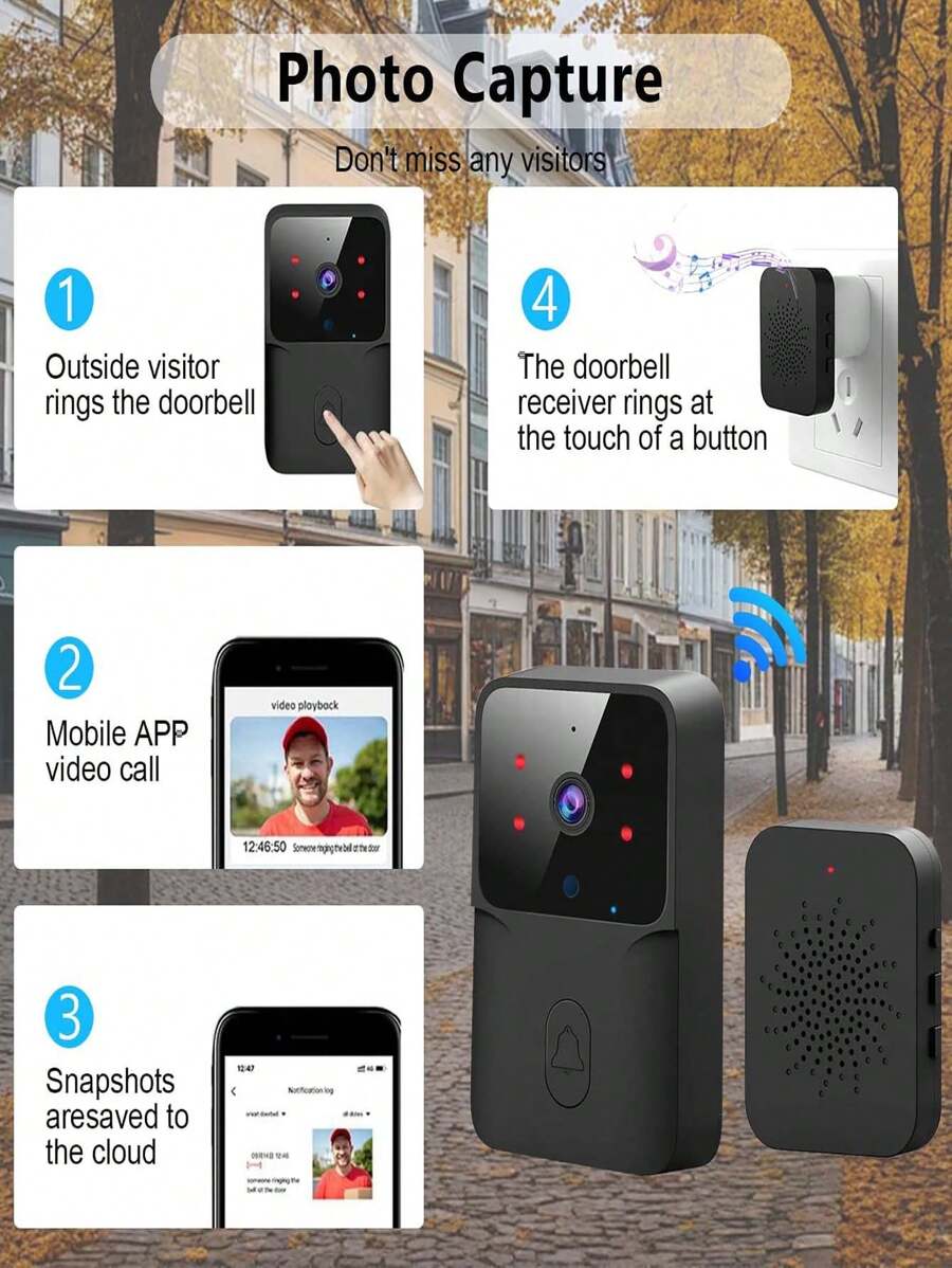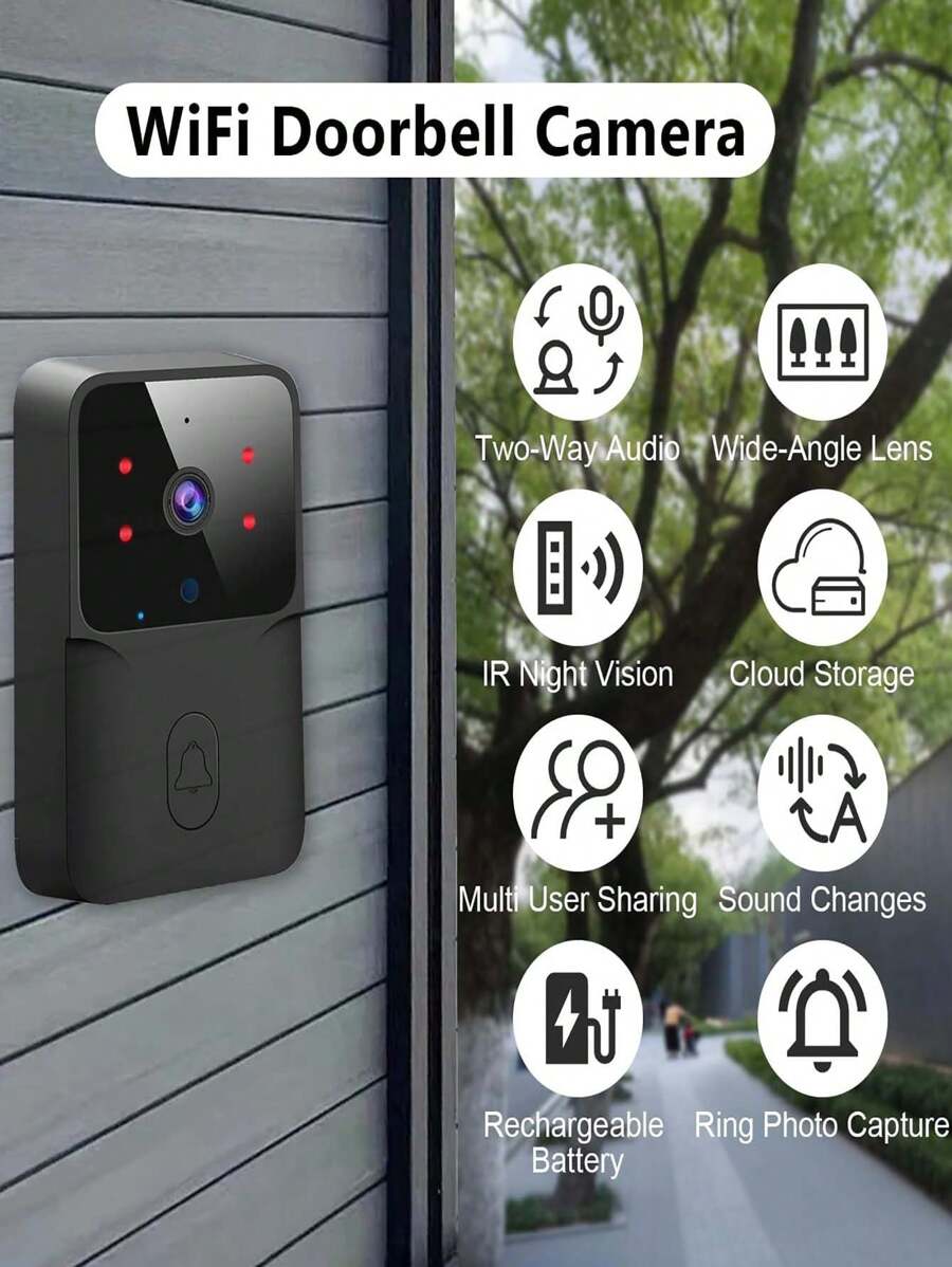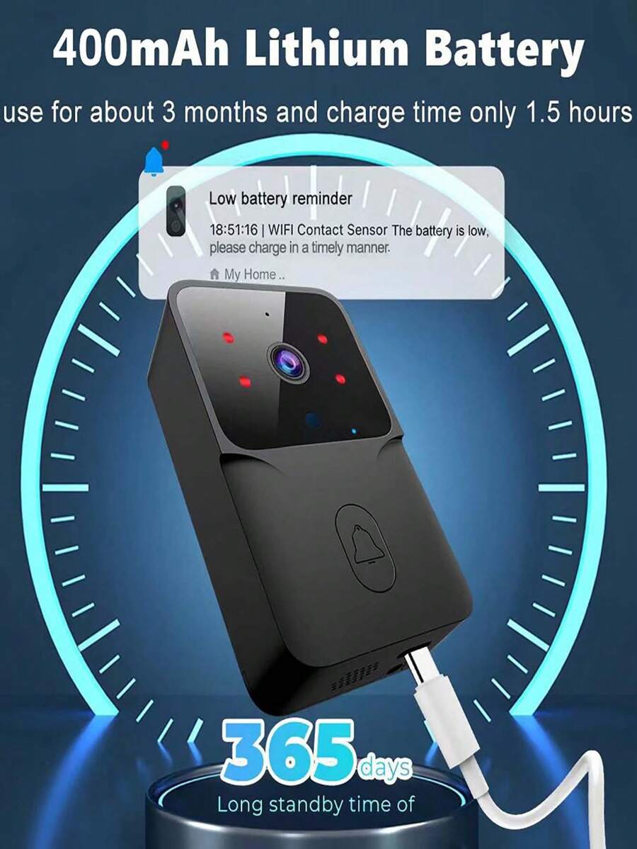 Color:- -Black Material:- ABS Connection Method:- WiFi Batteries Included:- Yes Product sellpoints Consumer Report Best Doorbell Camera|Blink Video Doorbell Camera|High Resolution Visual:Capture crisp images with a 133° wide angle, ensuring clear views of your visitors. Smartphone Notifications & 2-Way Audio:Stay connected with real-time notifications and seamless 2-way audio for instant communication. Night Vision & Cloud Storage:Equipped with IR LEDs, the doorbell offers clear night vision and free cloud storage for 3 days. Easy Installation & Power Supply:The wireless setup and 800mAh battery make installation a breeze, with no frequent charging needed. Strong Signal & Versatile Power:Enjoy a stable signal with a 10m range and power options including USB, AC adapter, and computer. Features: [Wireless Video Doorbell Camera] Support 2.4G WiFi and APP connection, high resolution, horizontal 133° and diagonal 155° wide angle, you can see wider and more clearly. [Smartphone Notifications and 2-Way Audio] When someone press the doorbell, it will capture images and push a notification to your smartphone immediately; with built-in mic, you can see and talk to your visitors at anytime and anywhere. [Night Vision & Cloud Storage] With built-in high-quality IR LED lamp beads, the picture is also clear at night; supported free cloud storage (3-day automatic cycle cover), no need of TF card. [Equipped with Doorbell Chime] Strong and stable signal, easy to pair up, the transmission range between the doorbell and chime is up to 10 meters; with USB power supply, easy to install, no worry of low battery. [Power Supply] The doorbell is powered by built-in 800mAh large battery, has long working time after fully charged through power bank, AC adapter, computer, and more, no need to charge frequently.