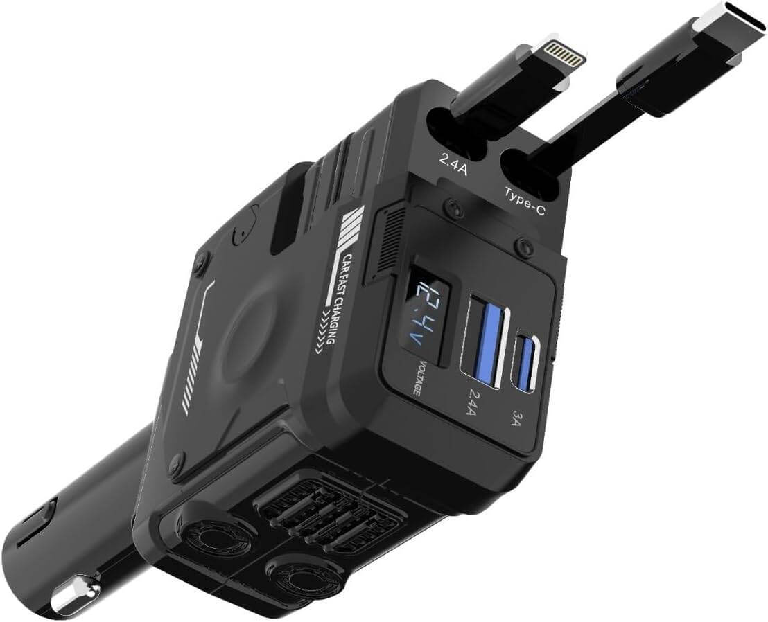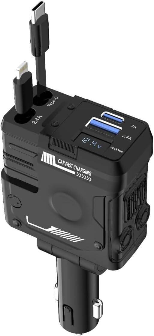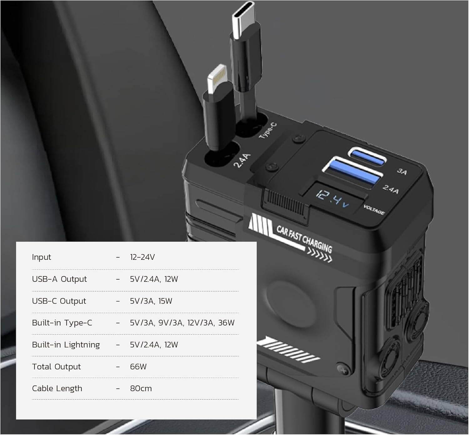 The Porodo 66W Car Charger with Lightning and Type-C cables ensures fast and efficient charging on the go. With a wide input range of 12-24V, it is compatible with most vehicles and offers a total output of 66W, supporting simultaneous charging for multiple devices. It features a USB-A output of 5V/2.4A (12W) and a USB-C output of 5V/3A (15W), along with built-in Type-C (5V/3A, 9V/3A, 12V/3A, 36W) and Lightning (5V/2.4A, 12W) cables, catering to a variety of devices. The 80cm cable length provides convenient reach, and the voltage monitor adds safety by keeping track of the car battery’s health. With universal compatibility and a compact design, this car charger is an essential accessory for reliable on-road charging.