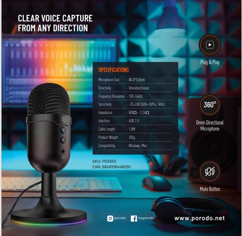 The Porodo Gaming Omni-Directional USB Microphone represents a high-class integrated audio solution that targets computer game players, streamers, and content producers alike. Boasting -32±2dB of sensitivity with an expansive range in frequency between 100Hz to 16KHz, this microphone achieves the most professional clarity in delivering clear sound or recorded voice within games. The 360° omnidirectional design assures consistent sound intake from all sides and is thus perfect for group discussions or immersive game sessions. This device comes with a convenient mute button, has push-activated noise cancellation for the crispest possible audio, and is customizable with RGB lighting to suit your setup. Compatible with both Windows and Mac operating systems, it's plug-and-play via USB 2.0 with a length of 1.8 m for flexible positioning. Compact but mighty, the Porodo Gaming Microphone combines functionality and style into one device that will address all your audio needs