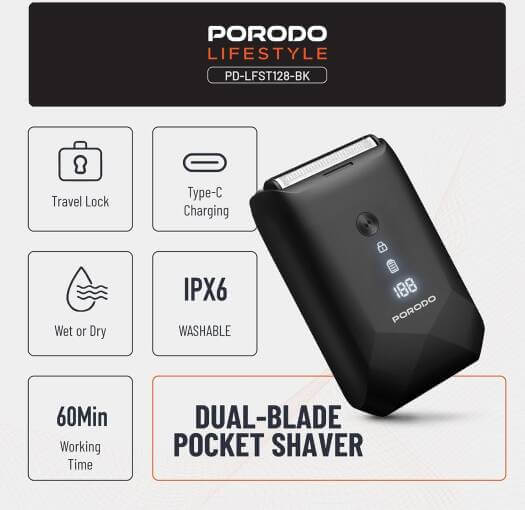 The Porodo Lifestyle Dual-Blade Pocket Shaver pairs convenience with functionality for a clean shave on the move. Fitted with a 600mAh battery, it provides up to 60 minutes of usage following a fast 1.5-hour charging via the Type-C charging port. Its high 8000RPM motor offers a quick and effective shave with every use.The shaver is compatible with wet and dry use and, therefore, versatile enough for any user preference. It is simple to clean thanks to its IPX6 wash rating, and its travel lock ensures it cannot turn on accidentally when stored. The shaver is 5W rated for power, but despite its small size, it cuts precisely and is excellent for use when traveling or on a daily basis.The 5V/1A input DC makes easy recharging convenient, so you're always ready for your next shave. Porodo Lifestyle Dual-Blade Pocket Shaver is your ideal grooming companion, bringing performance and convenience in a single sleek package.