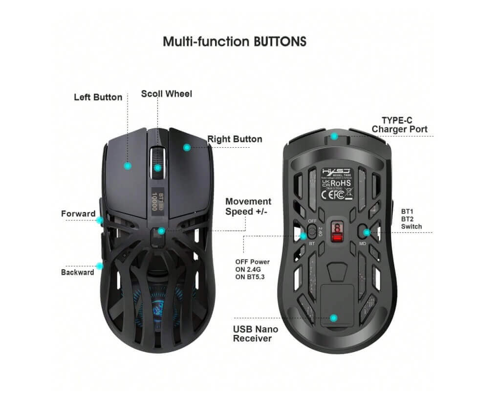 The mouse comes with a built-in rechargeable battery via a Type-C port, providing long-term use with fast and efficient charging.