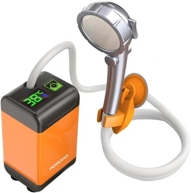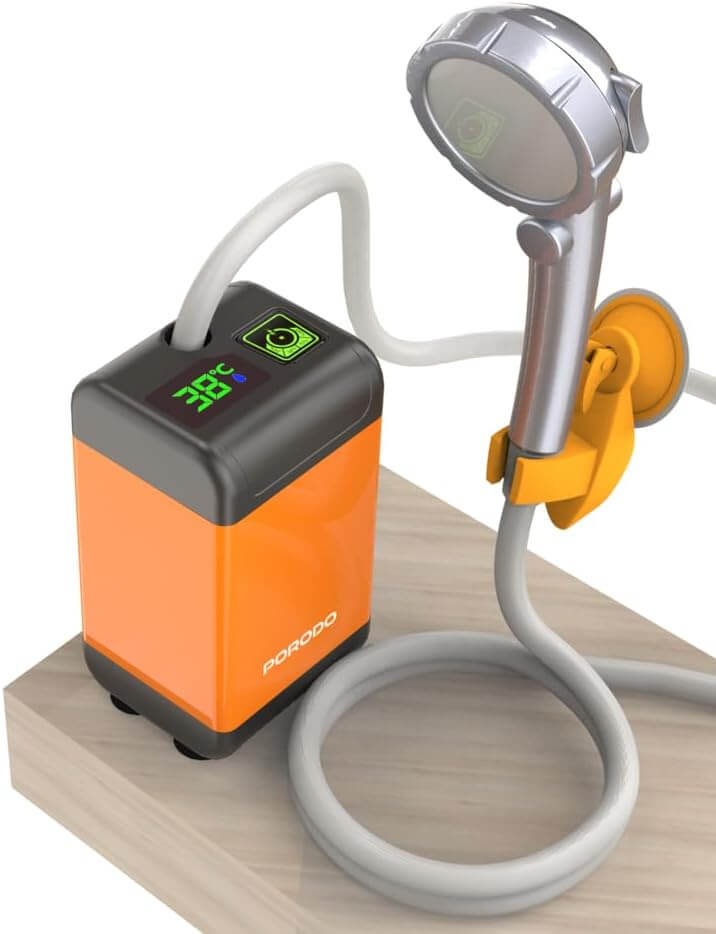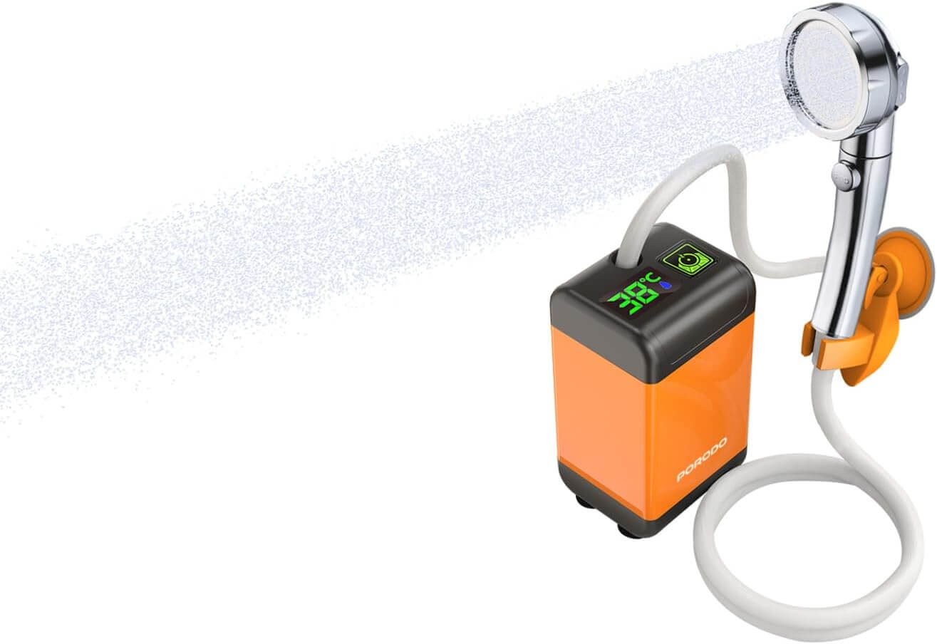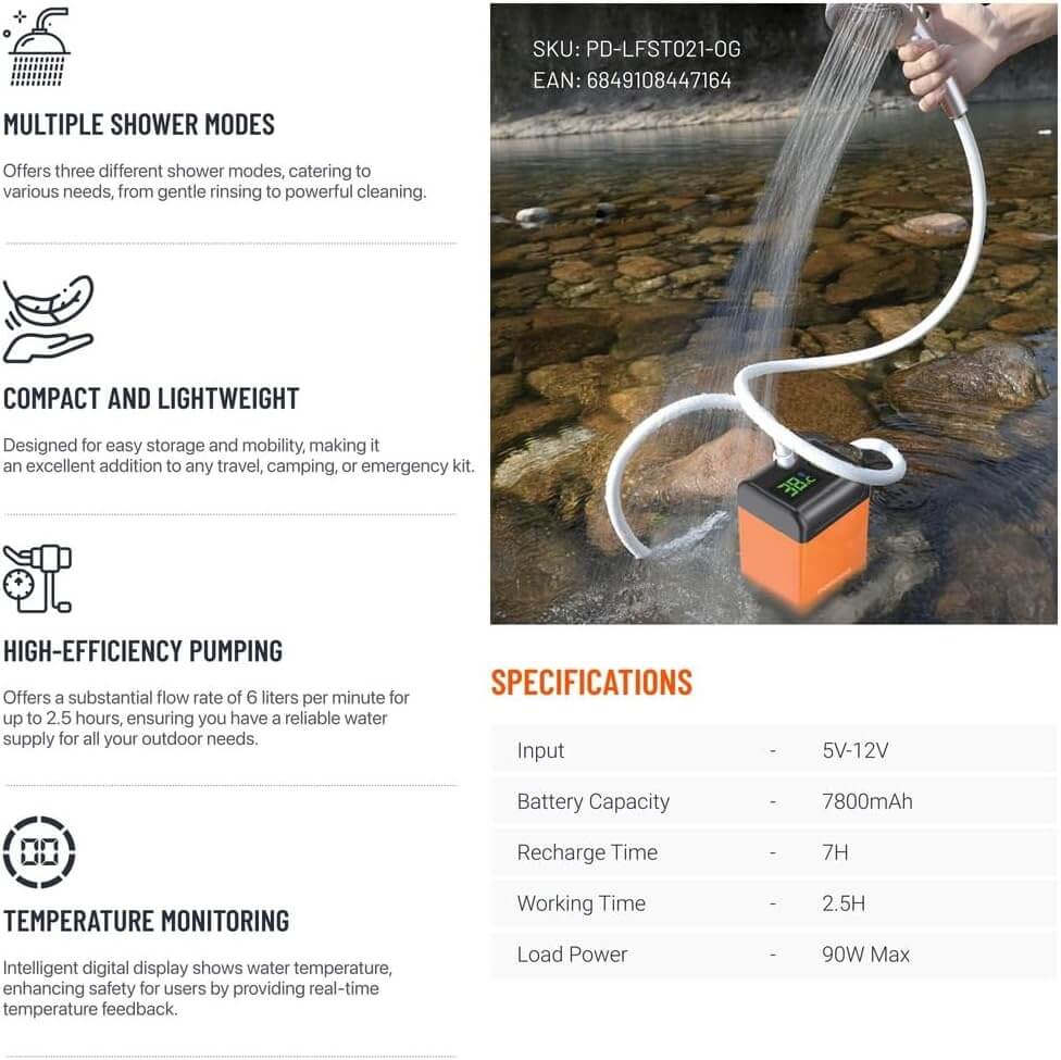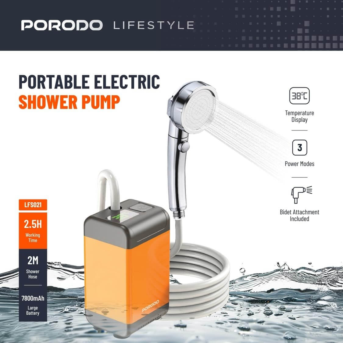 The Porodo Lifestyle Portable Shower is the ultimate solution for convenient, on-the-go personal hygiene. Designed for outdoor activities, camping, road trips, and even everyday use, this portable shower system offers a blend of convenience, performance, and ease of use. Featuring a temperature digital display, it allows you to monitor and adjust water temperature, ensuring a comfortable shower experience wherever you are. The built-in thermometer keeps you informed, so you never have to guess whether the water is too hot or cold. This portable shower boasts 3 power modes, allowing you to adjust the water flow based on your preferences. Whether you need a gentle rinse or a powerful spray, you can easily switch between settings to suit your needs. Additionally, with multiple shower modes, the showerhead provides various spray patterns, making it adaptable for everything from rinsing off sand at the beach to cleaning pets or washing off after a hike. The compact and lightweight design makes it easy to pack, transport, and store. Its 2-meter shower hose gives you ample reach, providing convenience when setting up your shower station in various locations. Powered by a 7800mAh battery, the Porodo Lifestyle Portable Shower offers 2.5 hours of continuous use, with a 7-hour recharge time to ensure you're ready for your next adventure. The bidet attachment included adds extra versatility, allowing for use as a portable bidet for personal hygiene or cleaning purposes, adding value for both outdoor and everyday use. With a max load power of 90W and a 5V-12V input, this portable shower is perfect for a wide range of activities, from camping to car cleaning and beyond.